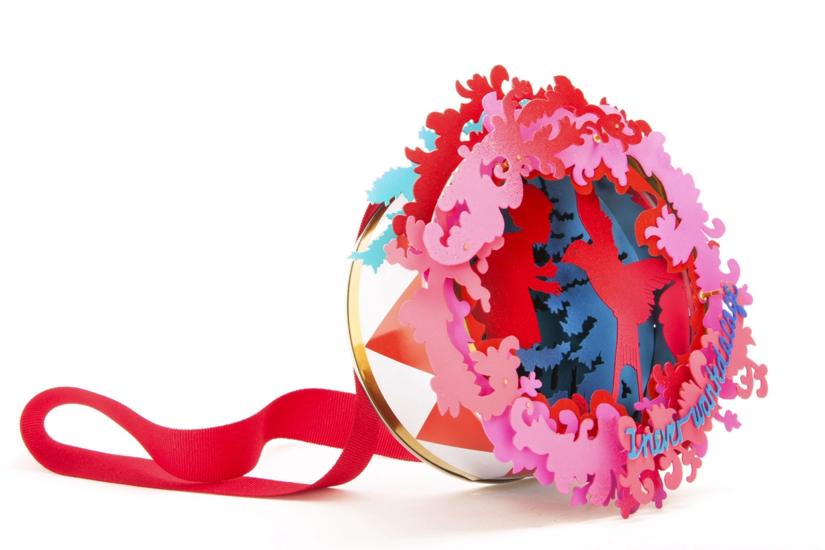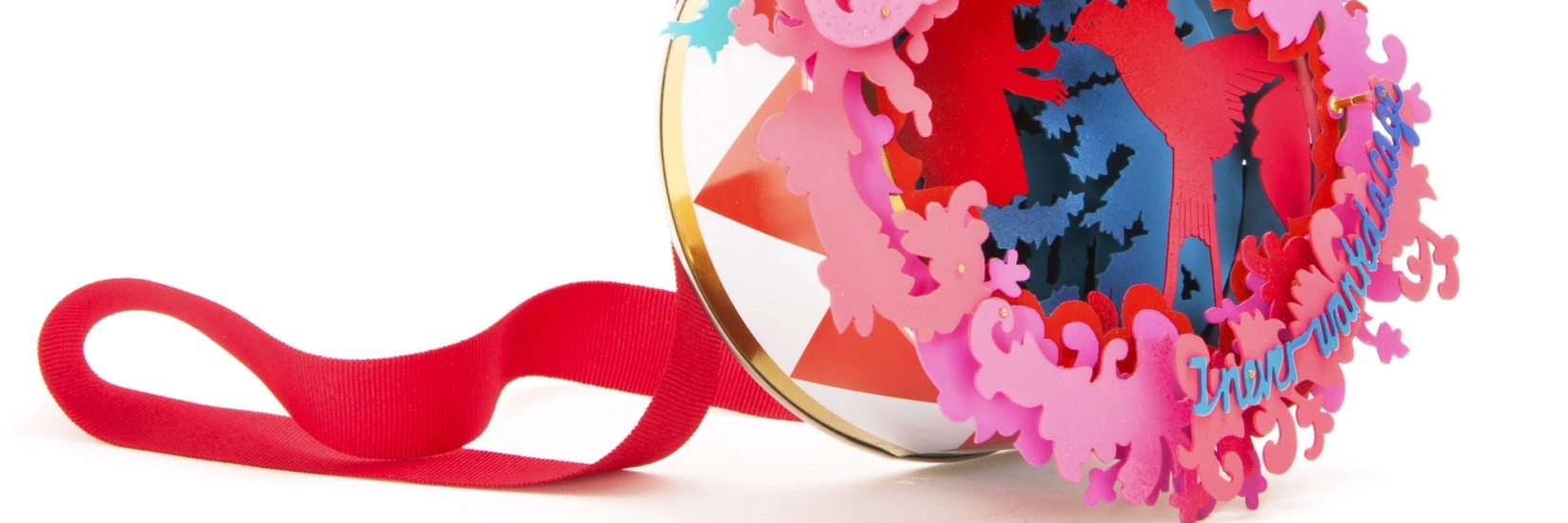 My jewellery is inspired by fairy tales, nursery rhymes, songs and stories. I want to tell a story through characters, colours and materials, and I want people to keep inventing new tales inspired by my jewellery. I make big, three dimensional jewellery in anodised aluminium, wood veneer, brass, gilding metal and silver. I use strong colours and different surfaces to illustrate and create atmospheres. I work in layers to build up a three dimensional piece. The size makes you aware of wearing the pieces at all times, they demand both space and attention.