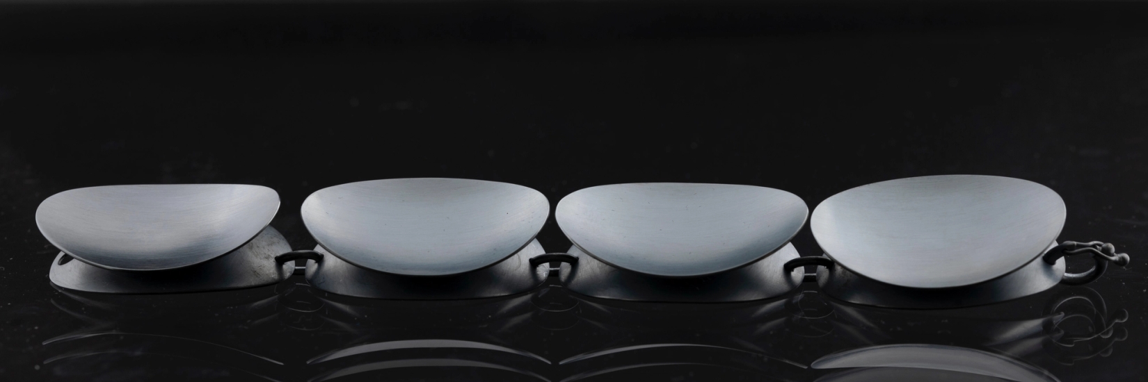 Jeg har over en lengre periode jobbet med sirkelen som utgangspunkt for mine funksjonelle smykkeserier. Sirklene valses til ovaler og slåes opp i konkave og konvekse former. Ovalene settes sammen til enkle, eller til større arbeider i et regelmessig mønster.