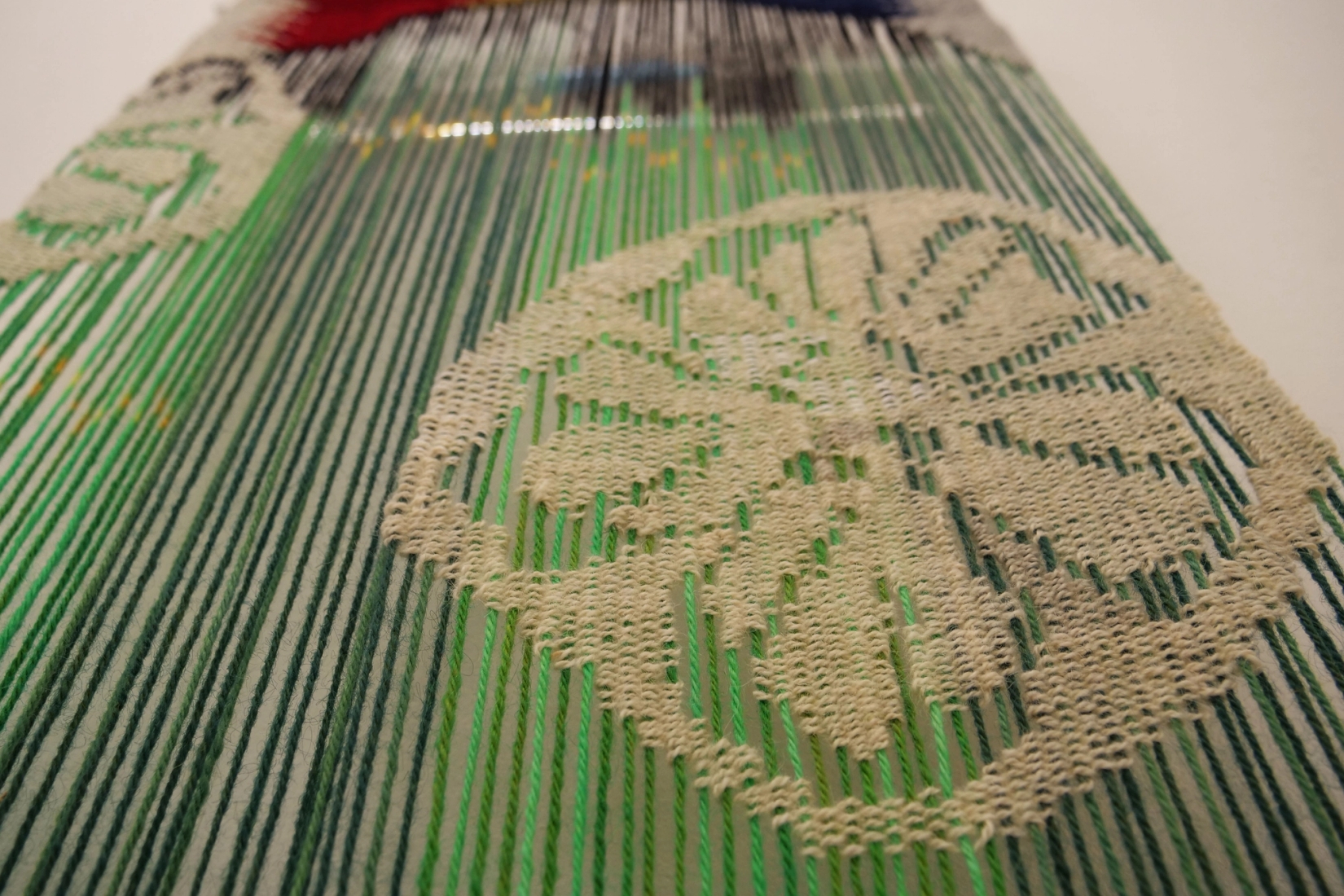 Samarbeidsprosjekt med kunstner Vebjørn Guttormsgaard Møllberg. Materialer: ull i renning og innslag. Transparent bildevev med ikat-farget renning. HxB 540cmx95cm