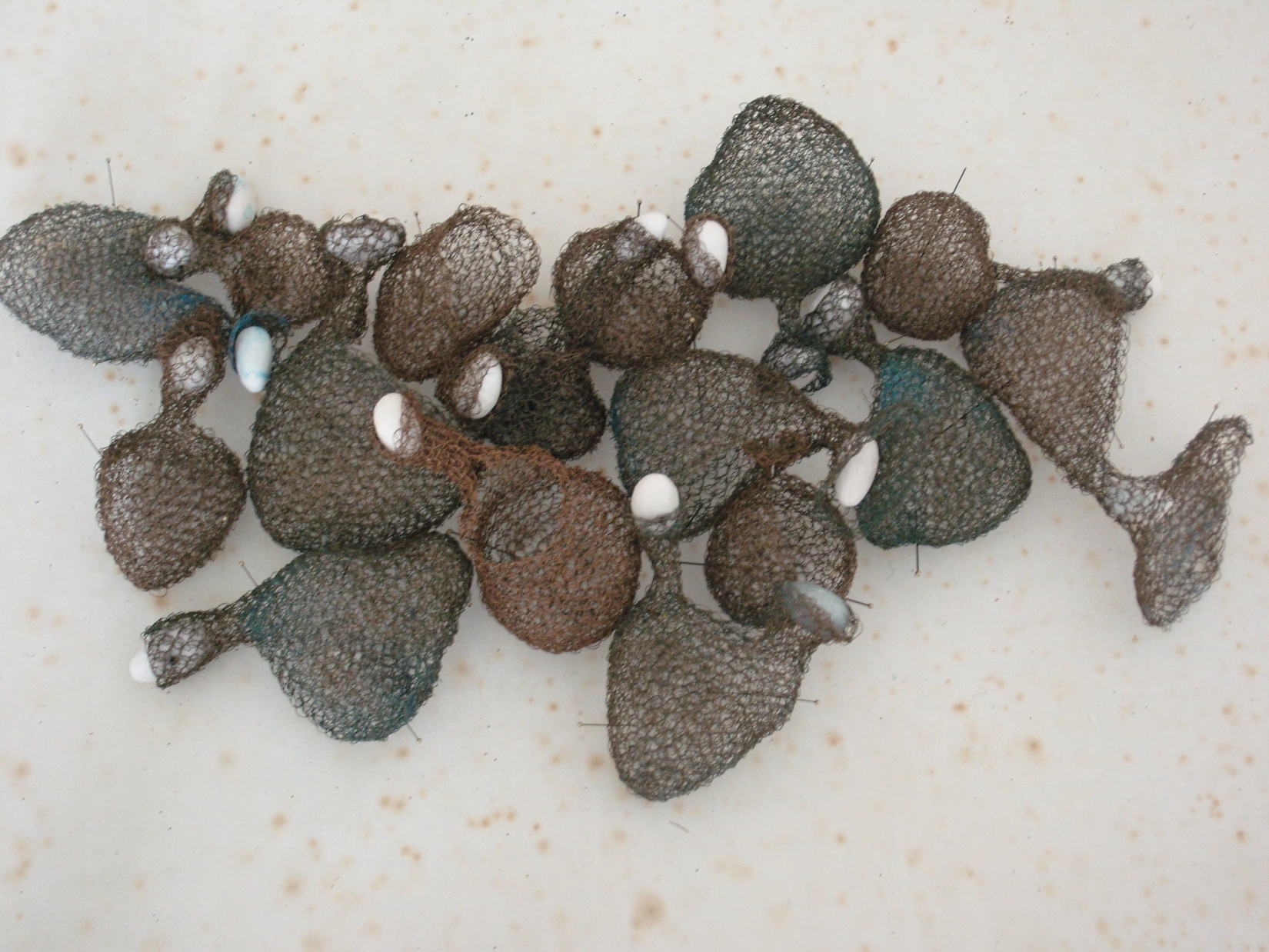 objekter heklet og farget i kobbertråd, trykknapper