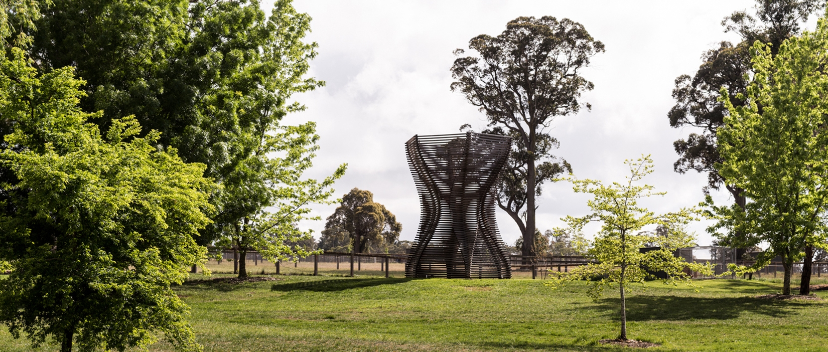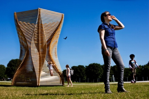 Romlig trekonstruksjon (dodektagon, tolvkant), urbolig illustrert med reisverk av kullbrent industriproduserte stendere/lekter 2”2” for vegg av norsk gran. Del av ”Gazebo uno” (lysthus for én) og en k…