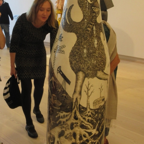 Modellert steingods, H 152 cm. Porselensbegitning, sort stains, glasur, platina. Råglasert. Bestillingsverk laget til CLAY, Middelfart, på Tommerup keramiske værksted