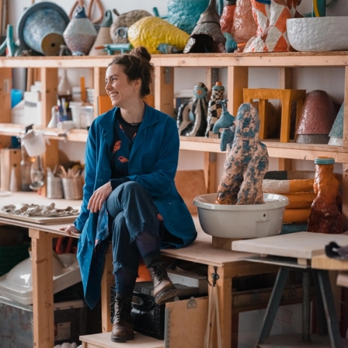 The atmosphere in Piscine Municipale reveals ceramic as the exhibition’s predominant material through a combination of hand-crafted tiles and recycled industrial bricks, whose glazed palette tones exp…