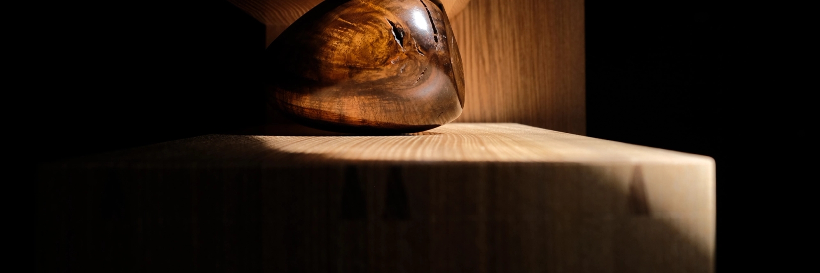 Skulpturell konsollbord laget i alm fra Nygårdsparken, Bergen og kiresebær fra Vindafjord