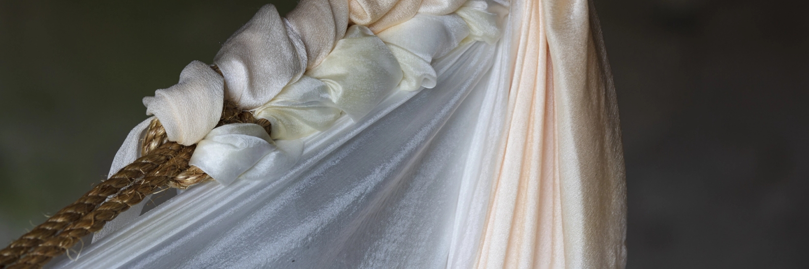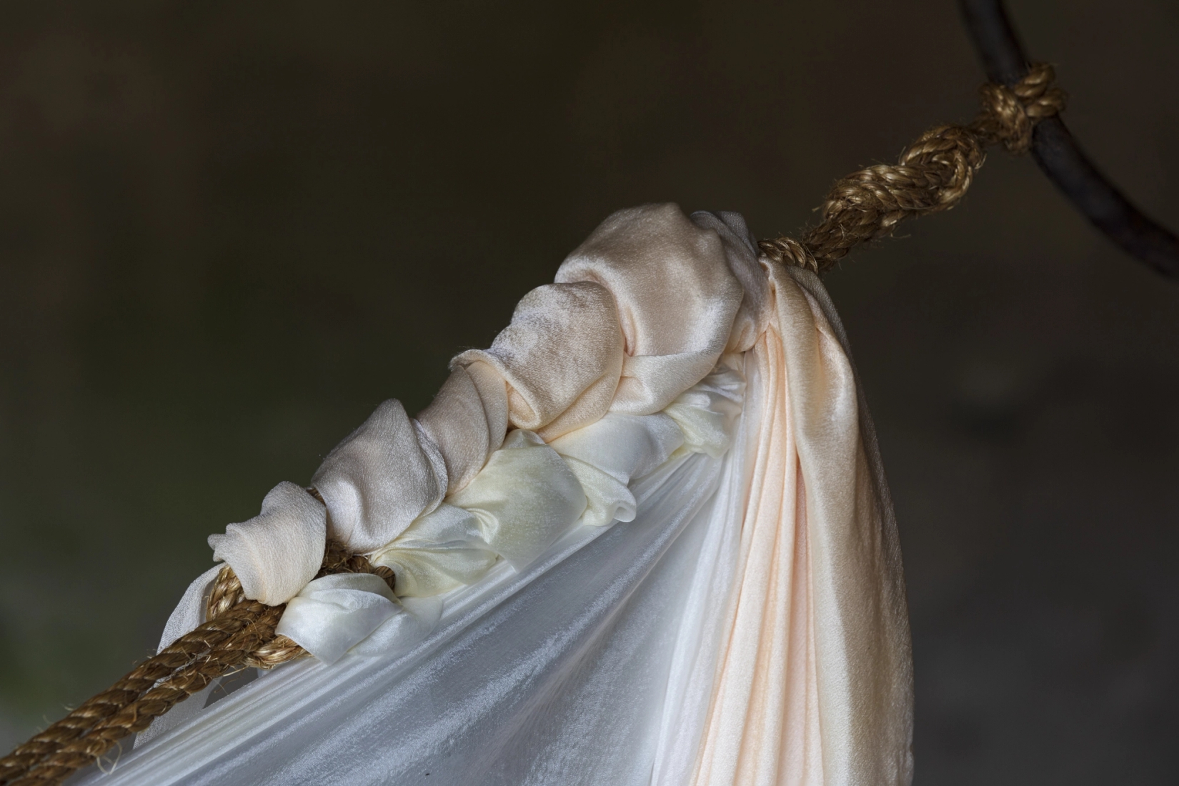 Stedsspesifikk installasjon ved skulpturbiennalen STAUP 2017, Levanger. Håndfarget silke, tau, klatreplanter.