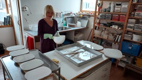 Jeg har arbeidet med keramikk siden 1975, i et område mellom bilde og bruksting som fliser, krukker, skåler, fat med mer, fra ganske stort til ganske lite format. Brukstingenes rike historie, alle assosiasjonene de bærer med seg og mangfoldet av uttrykk tiltrekker meg, mer enn å løse rent praktiske bruksoppgaver. I de senere årene har jeg i større grad utnyttet de maleriske mulighetene som glasur og leire har, og inkluderer mer uventede virkninger fra flere runder med brenning. Jeg arbeider med farge, tekstur og dybdevirkninger i dialog med de fysiske og kjemiske variasjonene som materialet selv byr på. (Foto over: Elisa Helland-Hansen, til venstre: Lars Brunborg)