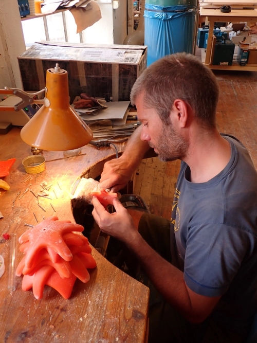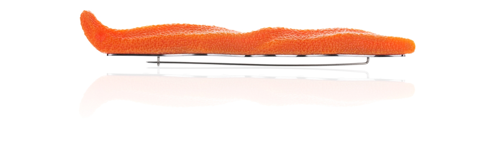 Jeg fant en bit av en oransje trålkule i plast et sted langs den Nordnorske kysten. En bit maritimt søppel. Biten hadde en hvit skjøt i midten. Jeg assosierte den med en laksekotelett og laget en bros…