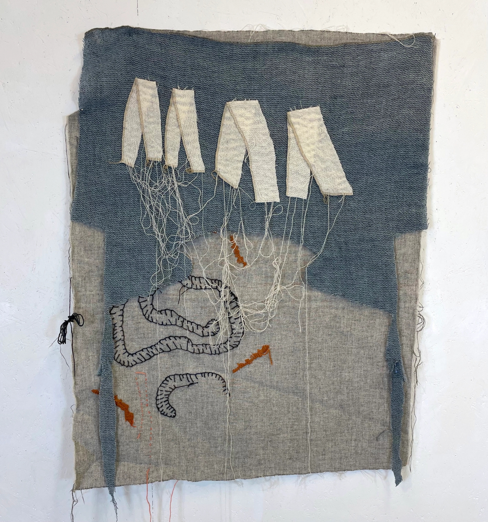 Rester av stoff og tråd, noe plantefarget, mest sauegfarget, egen stoffer, egne tråderbroderi frihånd