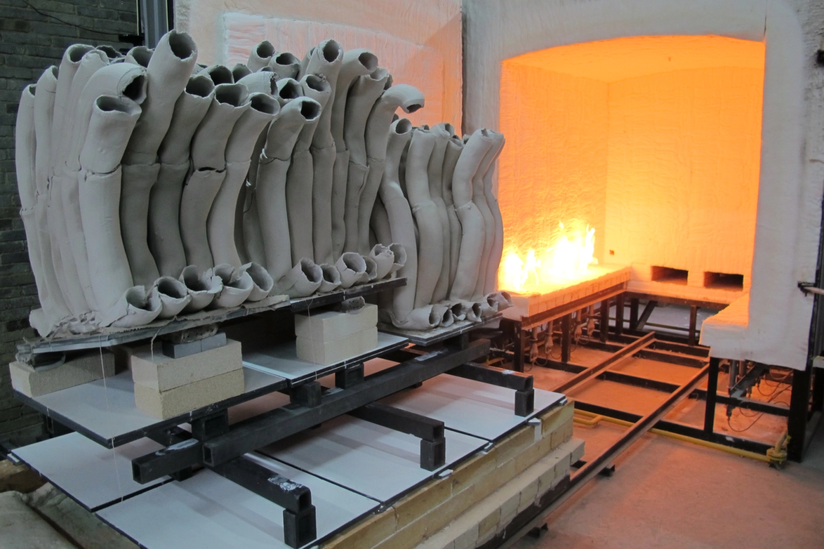 Fjøset Ringebu Prestegard 2018: Ekstruderte rørdeler brent i filler i vedovn, montert sammen på armeringsjern. Lengde 200 cm. Foto Torbjørn Kvasbø