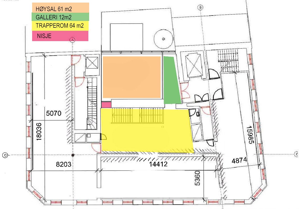 - I tillegg stilles høysalen, med dobbel takhøyde, til disposisjon for hengende verk (da gulvet må være fritt). Høysalen har inngang i 1. etg. og tilhørende galleri i 2. etg.
