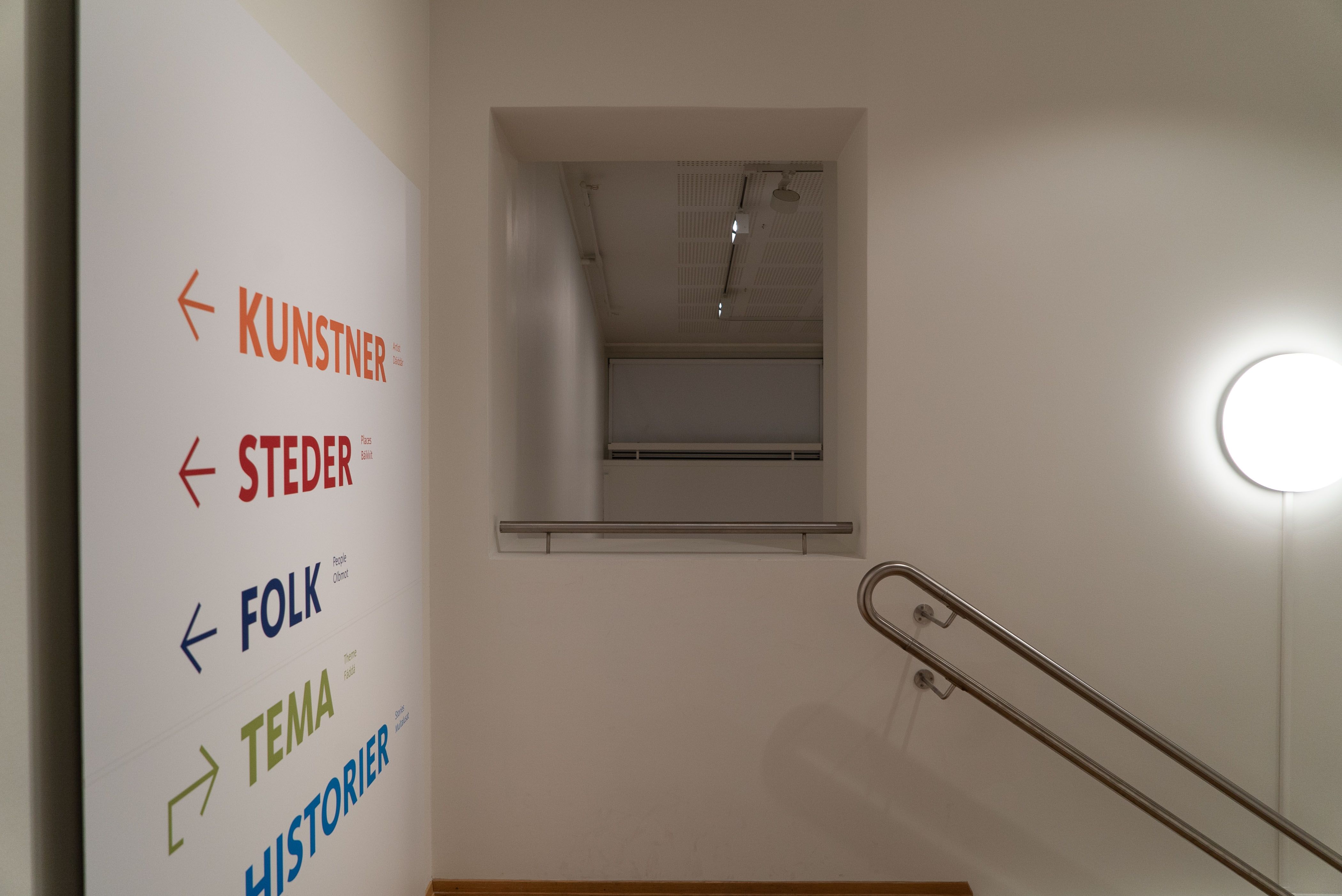 - Utenfor høysalen går trappegangen mellom museets 1. og 2. etg., som også stilles til utstillingens disposisjon. Ved toppen av trappen er det en åpning som gir sikt inn til høysalen.