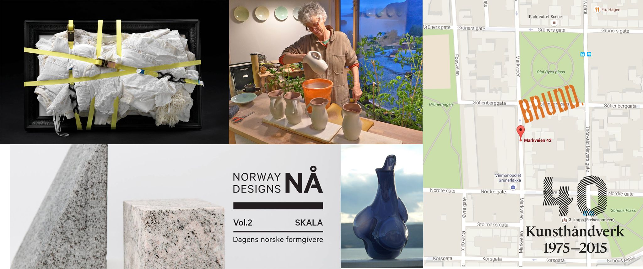 Denne uken åpner årsutstillingen Kunsthåndverk 2015 i Kunstindustrimuseet i Oslo, Elisa Helland-Hansen i Galleri Format Oslo, utstillingen Norway Design Nå vol. 2: Skala i Norway Designs lokaler i Oslo sentrum, Ulla-Mari Brantenberg i Kunsthåndverkerne i Kongensgate og Den store jubileumsskattejakten, som arrangeres av BRUDD, starter på Grünerløkka!