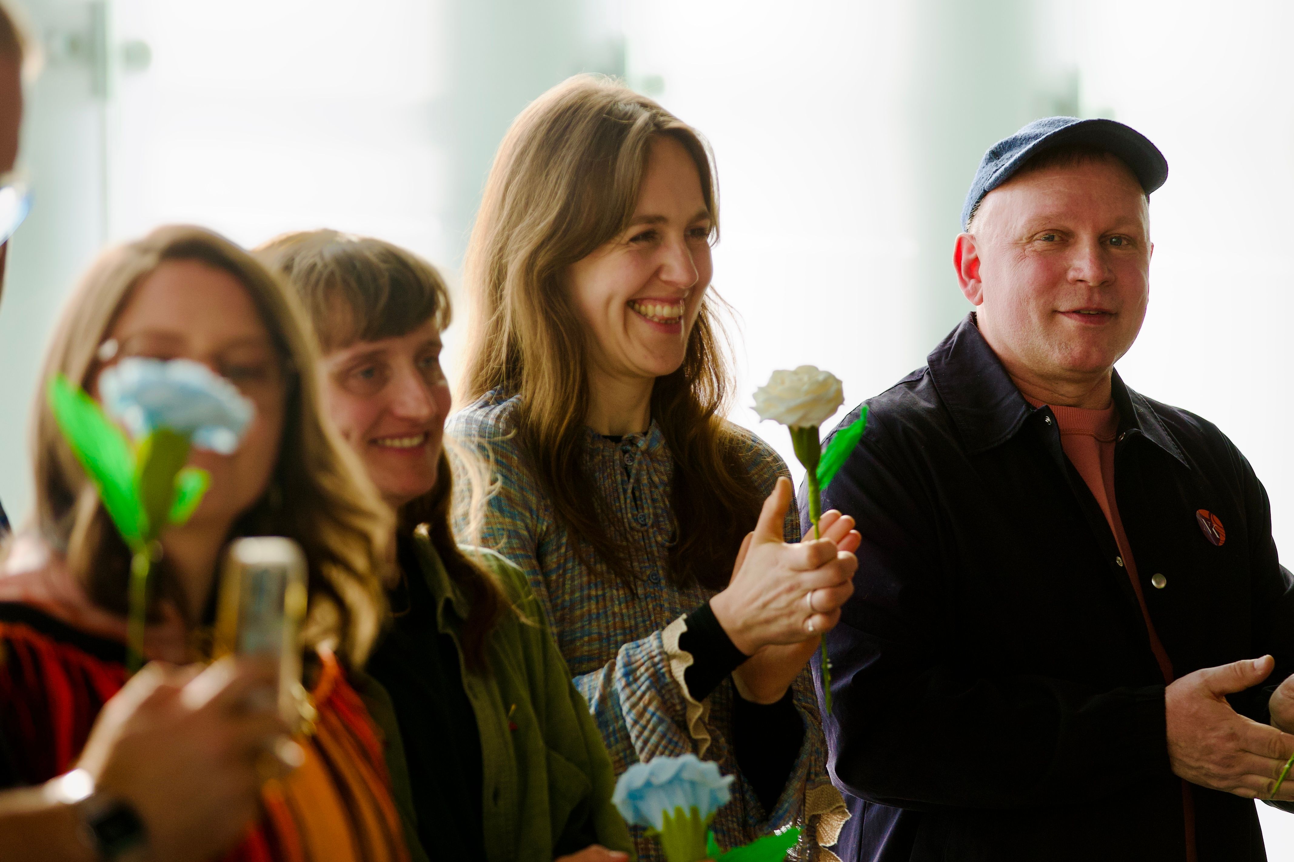 Etter talene ble kunstnerne kalt opp på scenen, hvor de mottok håndlagde papirblomster fra Viola Karlsen sammen med varme ord. Gaven var en passende hyllest, gitt utstillingens plassering i et bibliotek fullt av bøker.