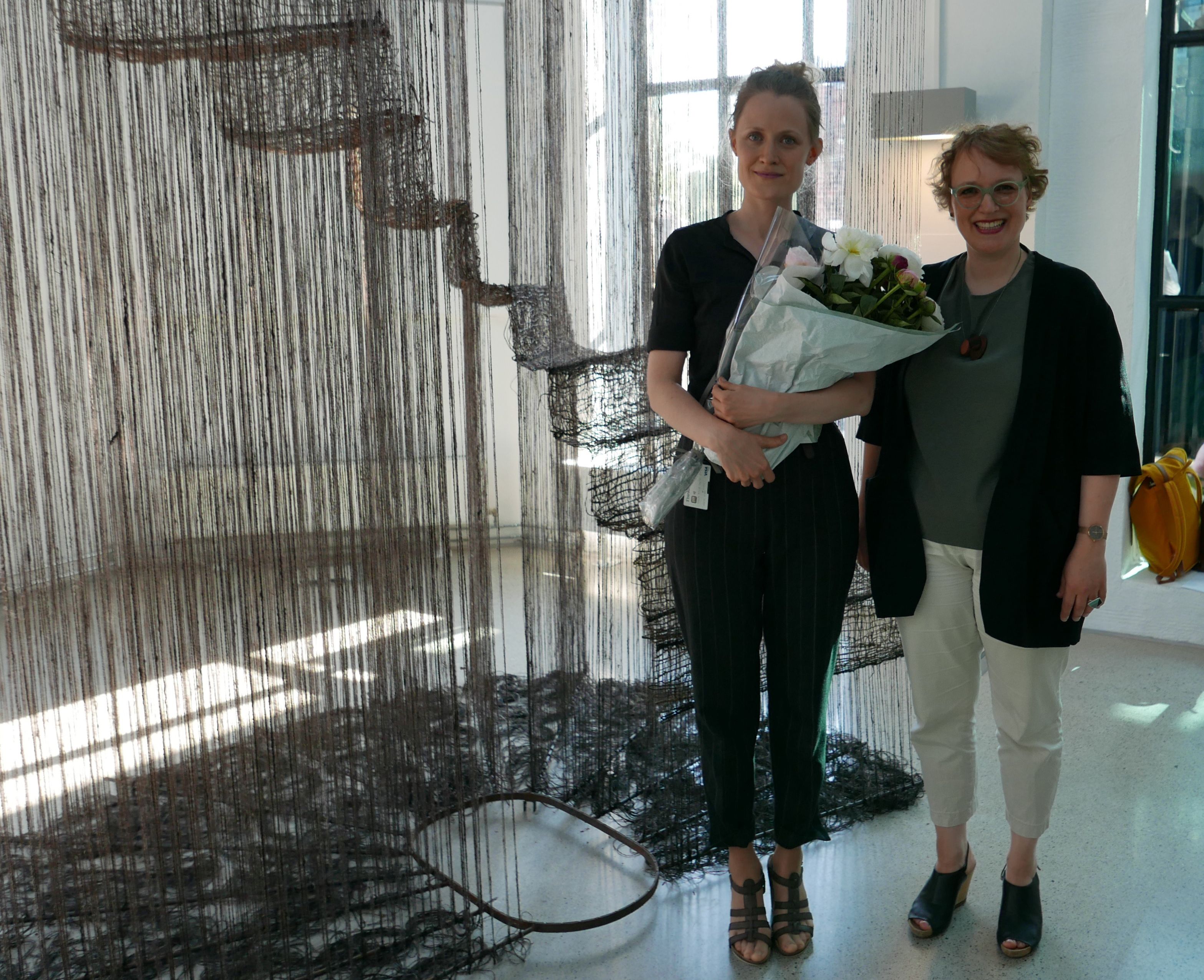 Men konstruksjonen som fyller rommet er en vevnad. Med 14 lag i veven har flatveven blitt romlig. Reisverket består av ømfintlige, håndspunnede tråder av ”svart ull fra Borgo” med innslag av ”granrøtter fra Leiteåsen og maretaumer fra Tunes og Krabbesundet”, kan vi lese. Nærheten til hånden, sankingen og sankestedet er gripende. ”Trappene heime”, heter verket, som faktisk utgjør en vevd vindeltrapp. Den står der som et manifestert minne midt i rommet. Et intervall uten destinasjon, men med en enorm tilstedeværelse. Den er massiv og luftig. Kunstneren henviser til Frida Hansens transparent-teknikk som en viktig inspirasjon, men teknikken er utviklet langt forbi opphavet.