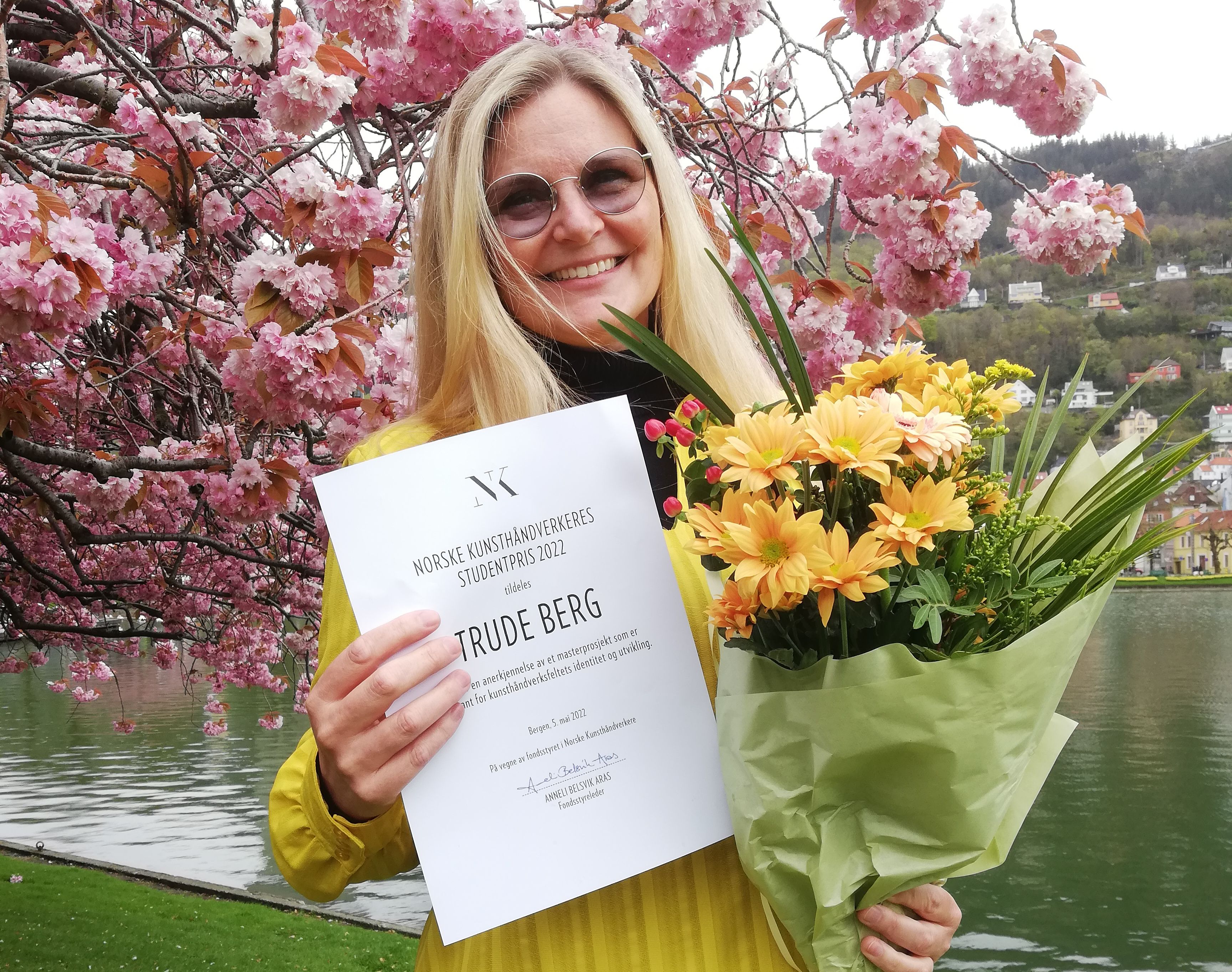 Det var en overrasket Trude Berg som mottok studentprisen 2022. Til NK skriver hun: – Det er en stor overgang å arbeide alene i sin egen boble på verkstedet, til det å vise arbeidene offentlig i Bergen Kunsthall. Å bli tildelt denne prisen betyr utrolig mye for meg, både som en bekreftelse på prosjektet mitt og som inspirasjon for videre arbeid. Det var mange sterke prosjekter i årets masterutstilling og jeg ble derfor veldig overrasket, stolt og glad over at juryen valgte mitt prosjekt.