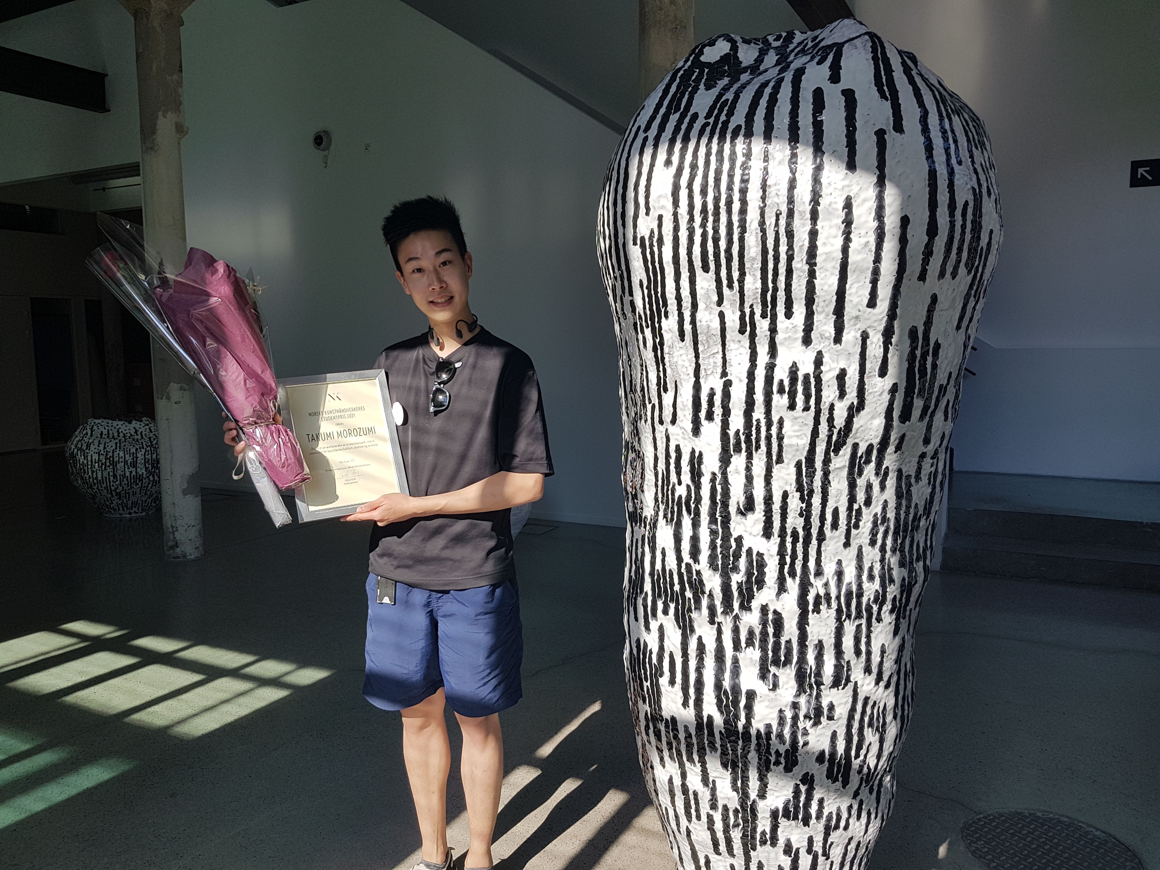 Takumi Morozumi mottok NKs studentpris i Oslo under åpningen av 2021 avgangsutstillingen «Drifting Matters» for masterstudentene på avdeling Kunst og håndverk og Kunst i offentlig rom ved Kunsthøgskolen i Oslo 4. juni. Det var NKs daglige leder Lise Stang Lund som delte prisen til Morozumi.