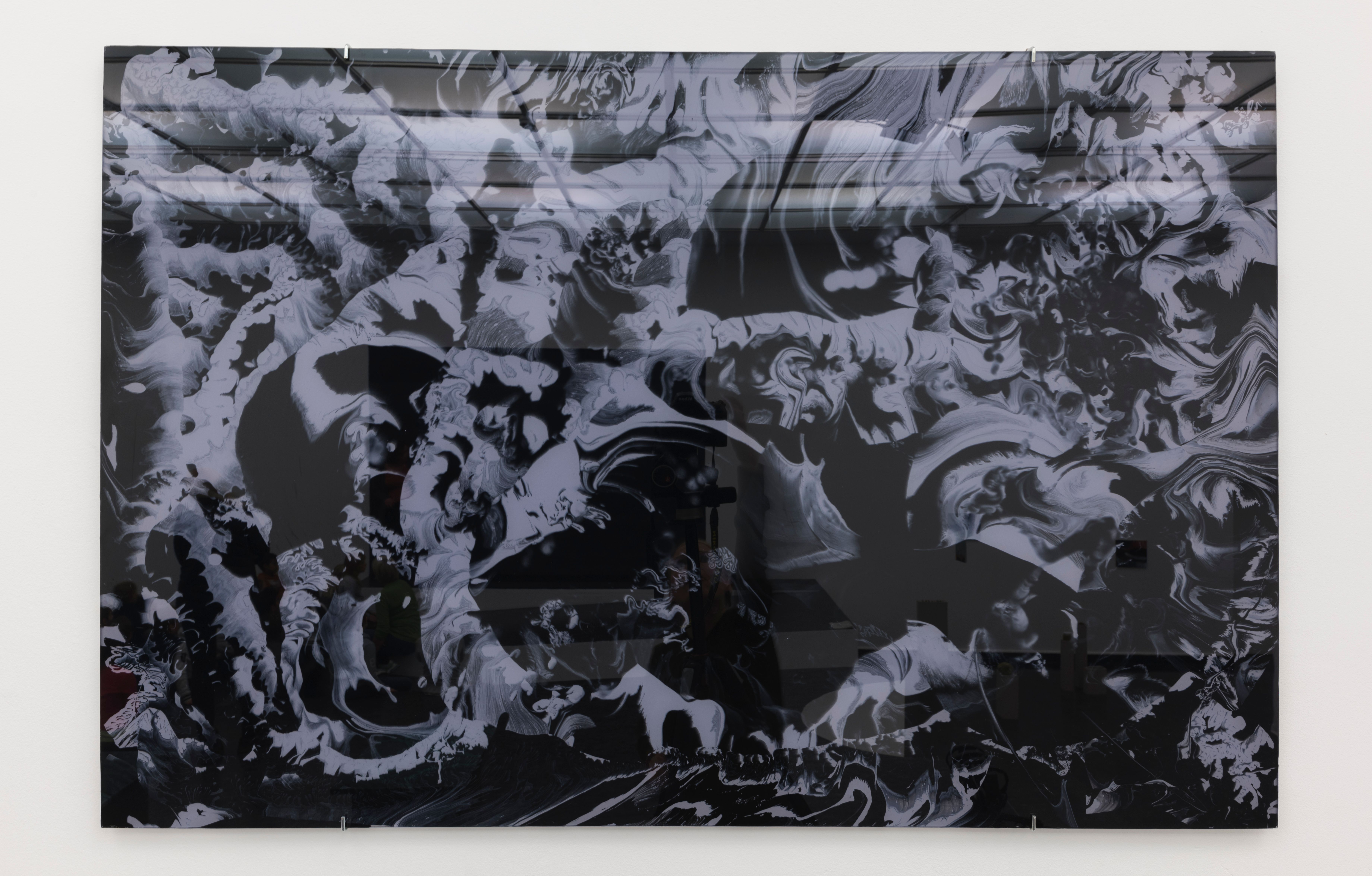 Ved å bruke akrylmaling på en måte som gir assosiasjoner til marmorering, skaper han en spenning mellom form og flate.