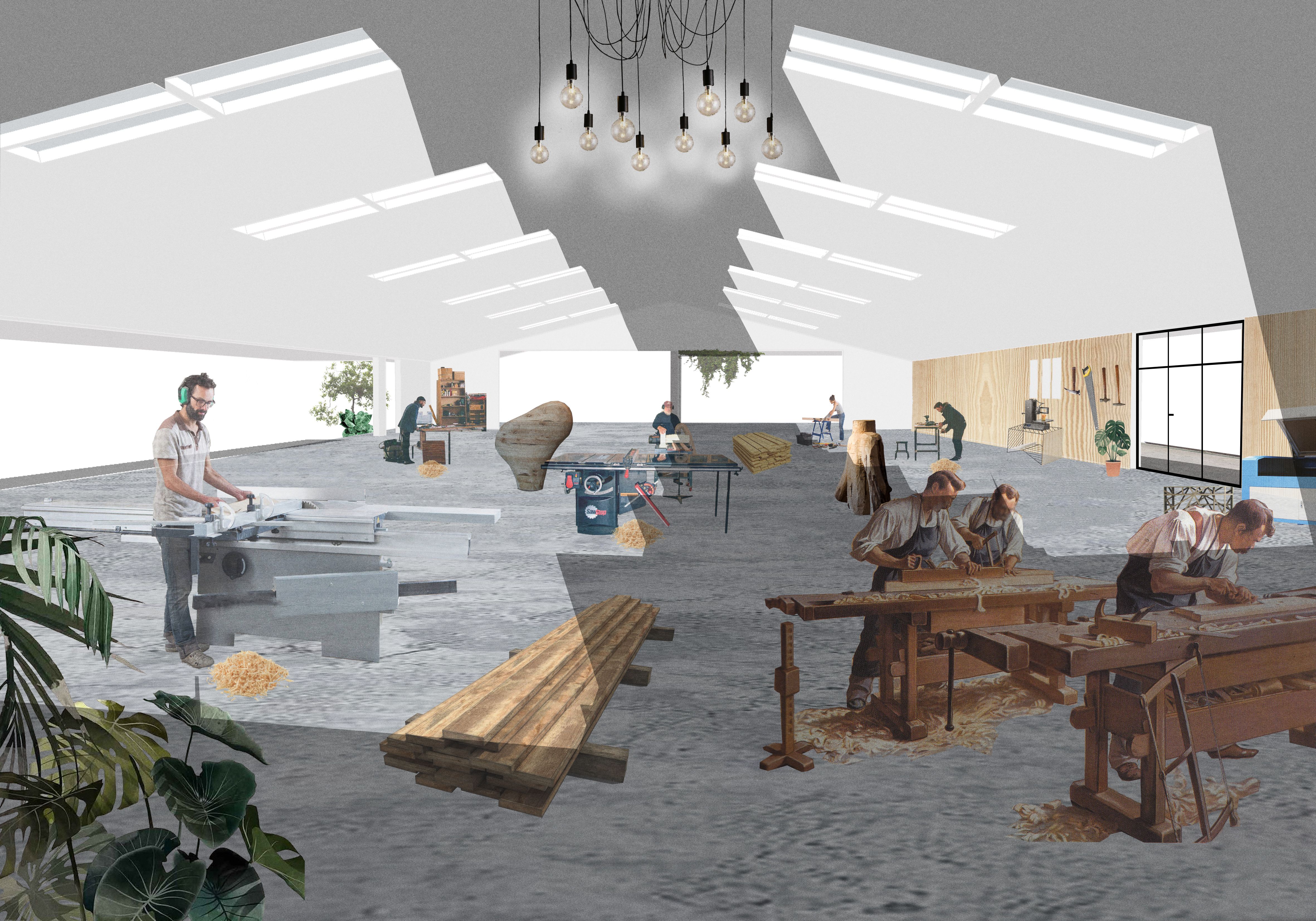 Transportsentralbygget i Nordøstpassasjen foreslås ombygget til verksteder, visningsrom og kunstnerboliger. Modellen er utarbeidet av Nøysom arkitekter