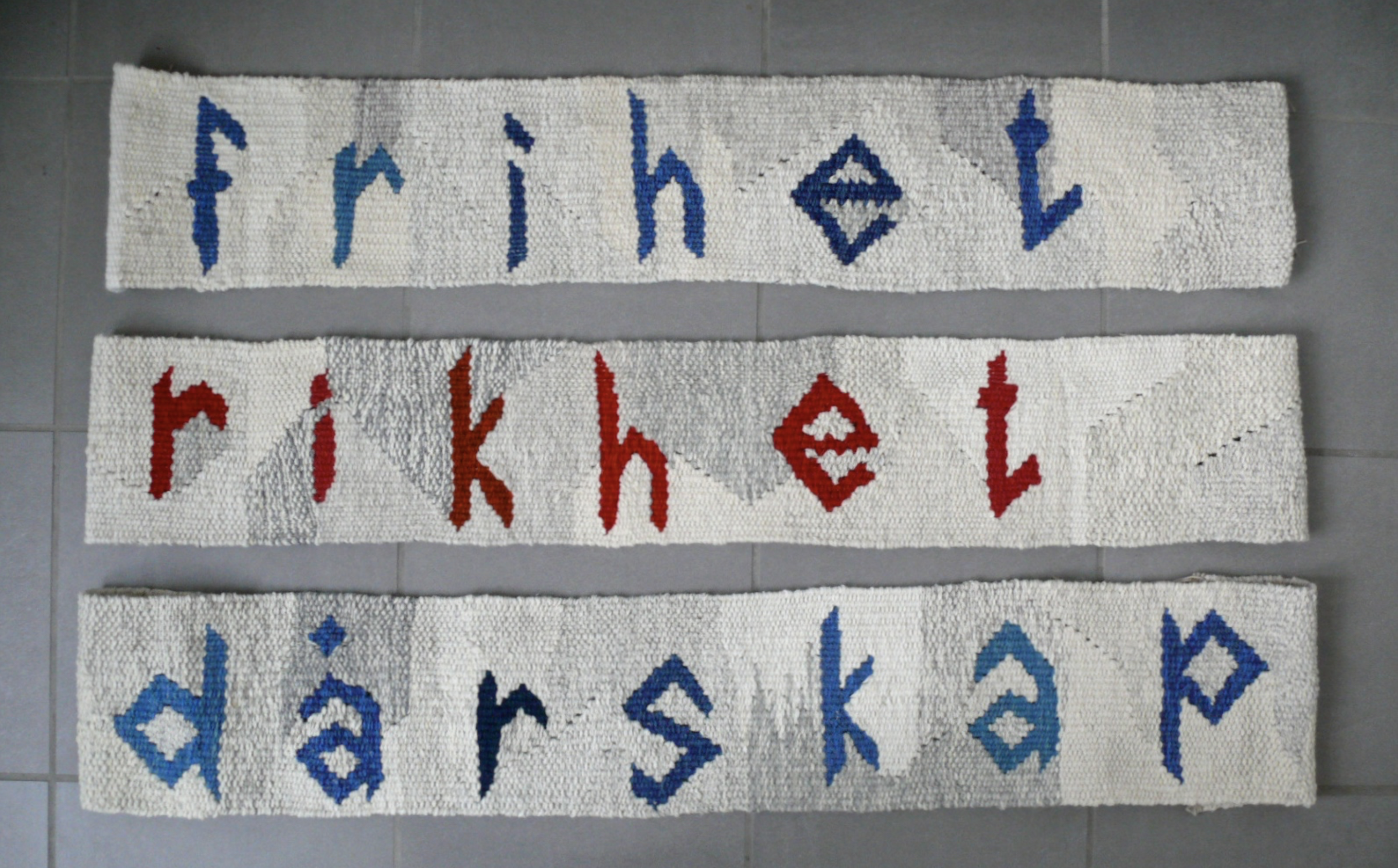 Ragnhild Lie er en av fire utstillere som deltar. Hennes vevde bannere av runeinspirerte bokstaver peker tilbake på dragestil, vikingetid og folkediktning. Installasjonen Frihet fra 2013, henspeiler på ordene fra den franske revolusjonen: Frihet, liket, brorskap. Ved å endre ordene til Frihet, rikhet, dårskap, ønsker Lie å sette fokus på samtiden og de holdninger og idealer som er rådende. Lie har hovedfag fra Kunsthøgskolen i Bergen med spesialisering på tekstil. Hun har base i Stamsund.