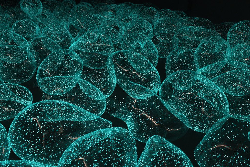 - I utstillingen, Pluviophile (regnelsker), vises en installasjon med selvlysende glass, samtidig som temaet regn står sentralt. Sasaki er opptatt av menneskers forhold til regn og hvordan dette værfenomenet påvirker oss psykisk, fysisk og kulturelt. Det bergenske regnet har Sasaki samlet, fryst og foreviget i organiske skulpturer av varmstøpt glass. På sin særegne måte har hun flyttet været innendørs, gjort det mer håndterbart og delvis eliminert de flyktige sidene. Været har blitt noe fysisk som hun kan studere, kontrollere og forme, avslutter pressemeldingen.