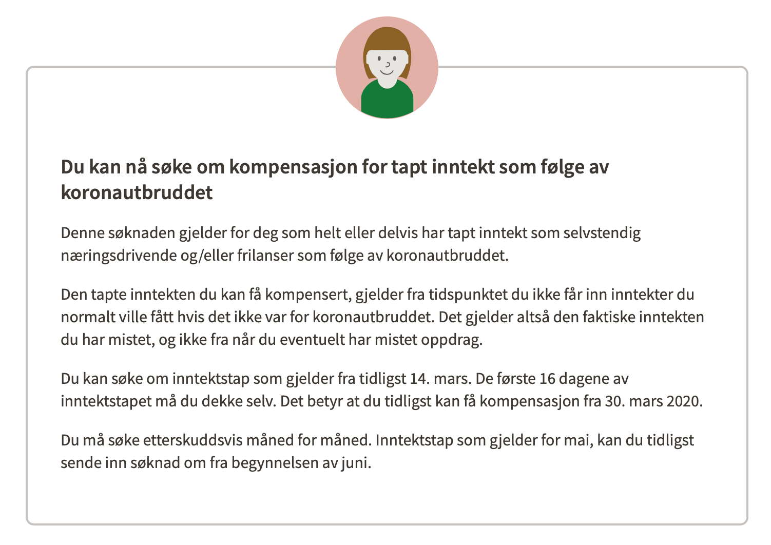 Det er viktig å merke seg at dette er en heldigitalisert saksbehandling med rask utbetaling. Det betyr at det er svært viktig å legge inn så korrekte og sannferdige opplysninger som mulig, inkludert årsak til bortfall av inntekt. Er det et reelt inntektstap du har, og du vet det er på grunn av koronakrisen, er det riktig å søke. Er du i tillegg mellom 18 og 67 år, og har personinntekt fra næring i 2019 på over 74 894 kr, kan du søke denne ordningen. Informasjonen du legger inn skal kunne etterkontrolleres, varsler NAV.