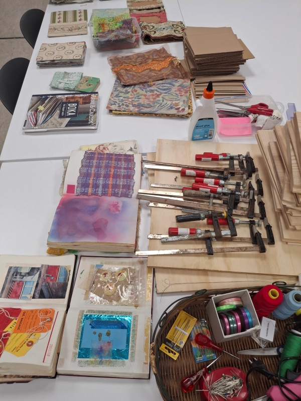 Lag din egen bok med gjenbruksmaterialer, diverse tekstiler, papp, papir, trelim, nål og tråd. Vi brukte diverse verktøy som tvinger/ presser/ og symaskin i utformingen av bøkene.