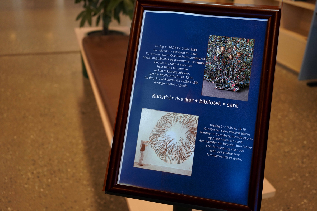 Velkommen til et spennende verksted for barn på Sarpsborg hovedbibliotek lørdag 11. oktober kl. 12–15.30. Kl. 12.00: Lesestund Vi starter med høytlesning med bibliotekar og deretter drop in til kl. 15.30 på verkstedet i 2. etg. Kl. 12.30: Kreativt verksted for barn Kunstner Svein Ove Kirkhorn inviterer barna inn i kameleonens verden gjennom ansiktsmaling og utkledning. Kameleon handler om å være kamuflert, og å gå i ett med bakgrunnen. Å kamuflere seg kan handle om å beskytte seg, å høre til, å ha sin egen plass, å gjemme seg, å gå i flokk eller å bli synlig – balansen mellom gruppeidentitet og individuell identitet. Barna får en presentasjon av ideen bak prosjektet og en innføring i det å være synlig eller usynlig. Framvisning for besøkende på biblioteket samme dag.