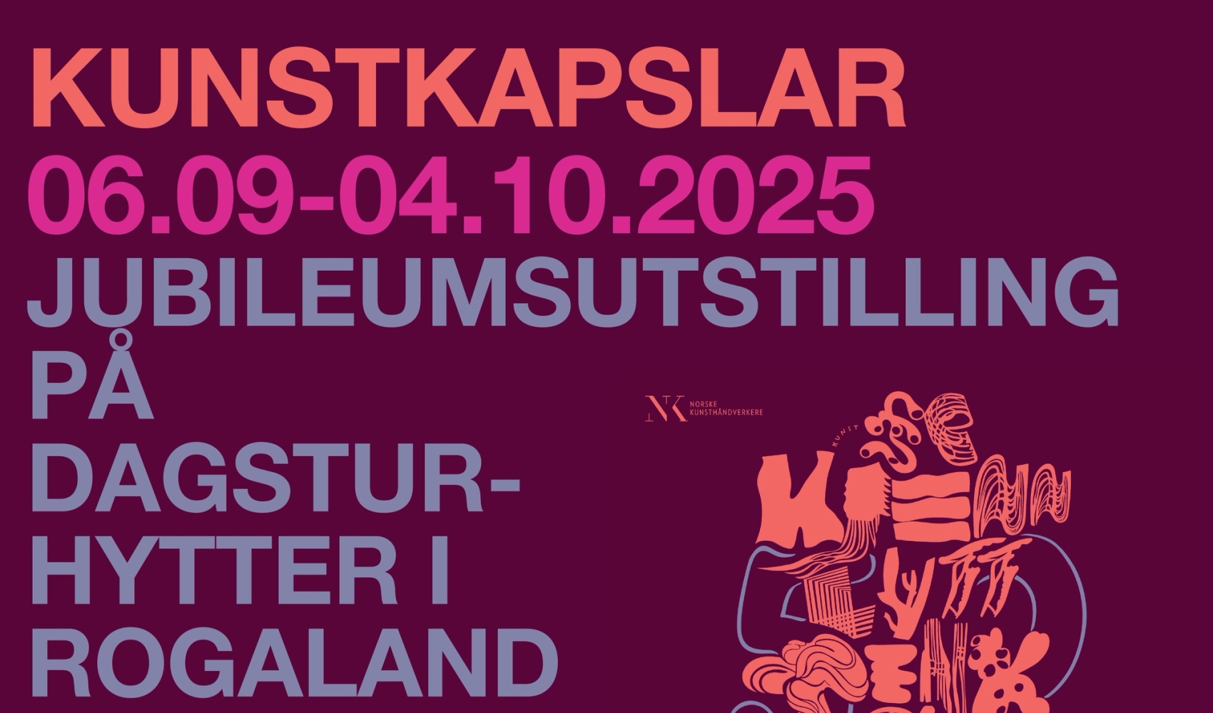 Fra 6. september til 4. oktober stiller kunstnarar ut på dagsturhytter i Rogaland. «Kunstkapslar» er ein del av Norske Kunståndverkere sitt 50-årsjubileum. Vi ønskjer å skape undring og å overraske med å plassere kunst der ein ikkje venter å finne kunst. Og løfte fram vår kunst i ulike materiale, for flest mogeleg. Utstillingen er støtta av: Rogaland fylkeskommune Norske Kunsthåndverkere Norske Kunsthåndverkere Vest-Norge Rogaland Kunstsenter Haugesund kommune Utsira kommune Kvitsøy kommune Suldal kommune Randaberg kommune Sandnes kommune Sola kommune Gjesdal kommune Klepp kommune Sokndal kommune Individuelle opninger på dagsturhytterna frå 5. september til 14. september. Informasjon i lenke.