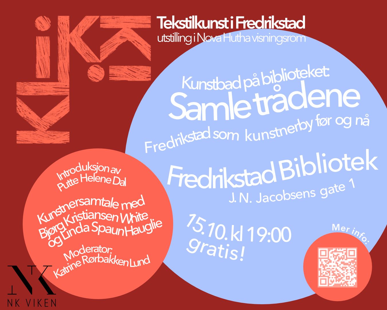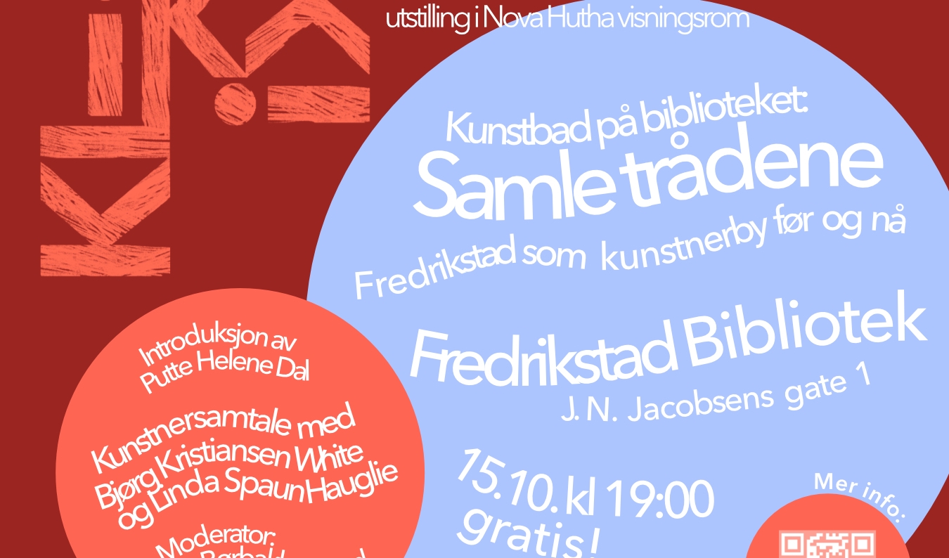 Kunstbad i Fredrikstad bibliotek onsdag 15.10 kl. 19–20.30 «Samle trådene: Fredrikstad som kunstnerby, før og nå» Kunsthåndverkere fra ulike generasjoner samles til en samtale om egne kunstnerskap og om Fredrikstad som kunstnerby, før og nå. Styreleder i Norske kunsthåndverkere, Putte H. Dal, gir en historisk introduksjon, før Katrine Rørbakken Lund leder en kunstnersamtale mellom to tekstilkunstnere med virke i Fredrikstad: Bjørg Kristiansen White (f.1943) og Linda Spaun Hauglie (f. 1982). Samle trådene arrangeres av den nystarta kunstnergruppa KLIKK! som også er aktuelle med utstillingen «KLIKK! Tekstilkunst i Fredrikstad» på Nova Hutha visningsrom på Holmen 25. september–19. oktober. KLIKK! består av fem tekstilkunstnere, alle med utdanning i tekstil fra Kunsthøgskolen i Oslo: Katrine Rørbakken Lund, Linda Spaun Hauglie, Ingrid Aarvik Berge, Karen Kviltu Lidal og Katrine Ellefsen. Arrangementet gjennomføres i samarbeid med Østfold kunstsenter og som en del av NK50 – Norske kunsthåndverkeres 50-års jubileum.