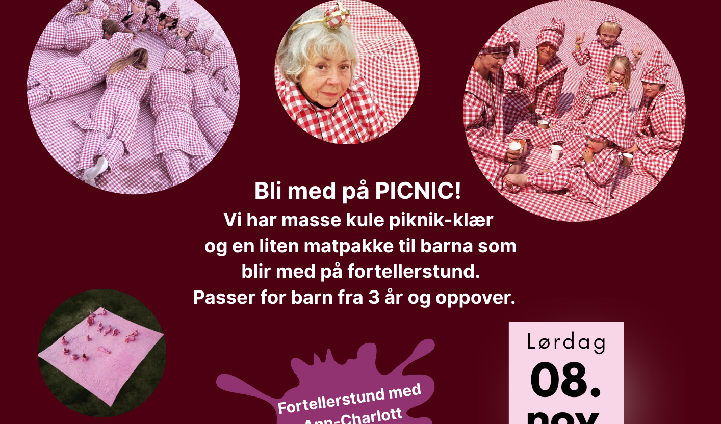 For barn: Kl. 11.00: Kle deg i PICNIC-klær og gjør deg klar. Kl. 11.30–12: PICNIC for barna med Ann-Charlott Christensen. Performance med publikumsdeltakelse i bibliotekets fantastiske aula. Med kunstnerne Svein Ove Kirkhorn og Ann-Charlott Christensen.
