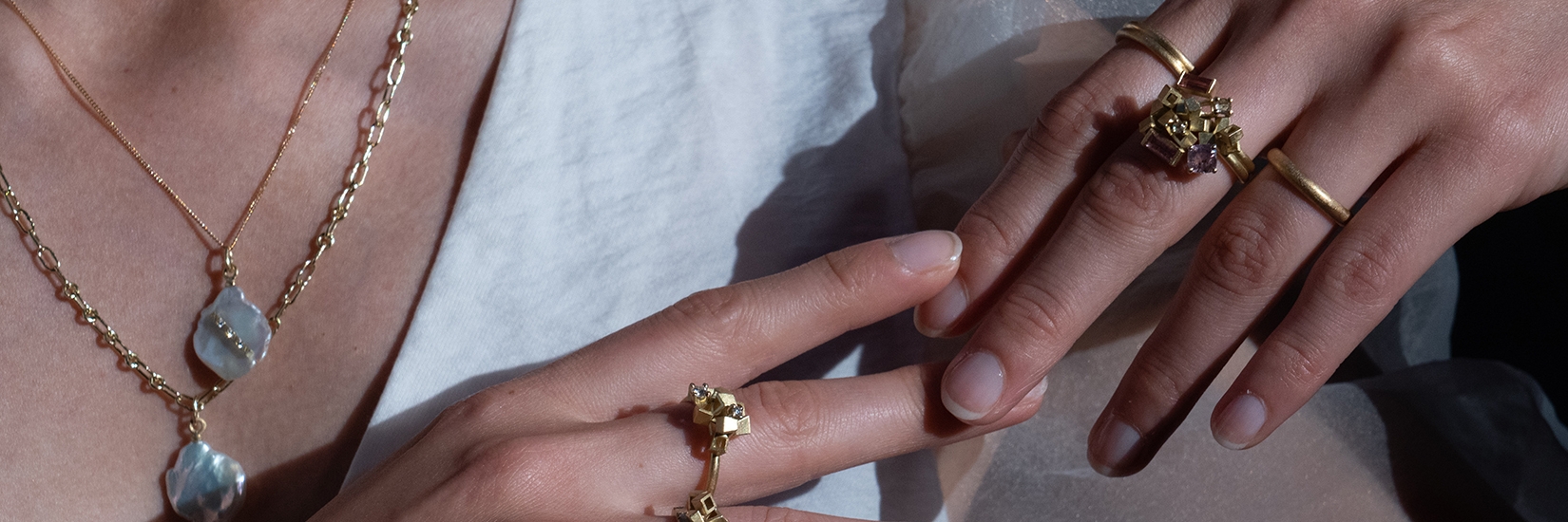 Dark Matter kolleksjonen er en serie unika smykker som er asymmetriske og skulpturelle i form med unike fargede stener.