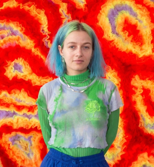 Amanda Vesthardt (b. 1993, Denmark) is a multidisciplinary/visual artist, with a focus on textile and fiber art. Coming from a background in fashion, she often explores various facets of textile waste and our relationship to objects. Over the past few years, she has become very interested in the relationship between our bodies and the textiles we wear. She has been exploring these notions through installation artworks and textiles within space. The concept of “costumes for the space” is a series of projects in which she researches and experiments with different themes such as our emotional connection to objects, tactile experiences, and storytelling through non-verbal communication like dance and performance. These projects are often executed in collaboration with other artists or designers to implement new perspectives. Most of Amanda’s work is based on the arts and crafts of textiles, involving various techniques such as knitting, tufting, sewing, embroidery, and patchwork. Handcrafting artworks and experimenting with new approaches are constant threads that run through all her works.