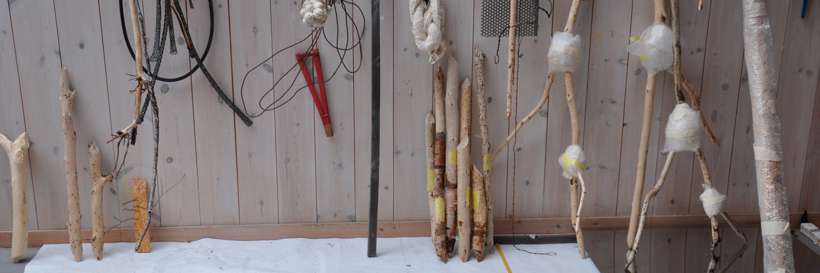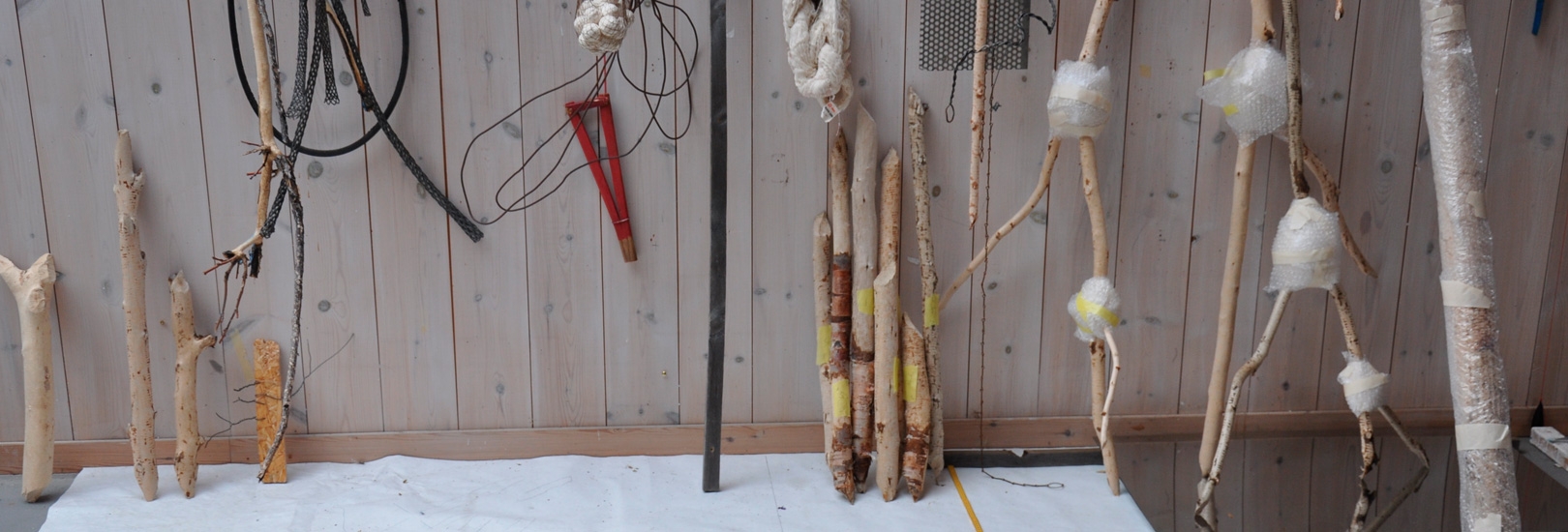 262 cm x 412 cm x 70 cm (h/b/d)Bevergnagde greiner fra ulike løvtrær – bjørk, vier, osp og selje. Enkelte ospegreiner videre beitet på av elg og rådyr. Bomullsgarn 20/2 og 24/2. Kabelstrømper. Ståltau…