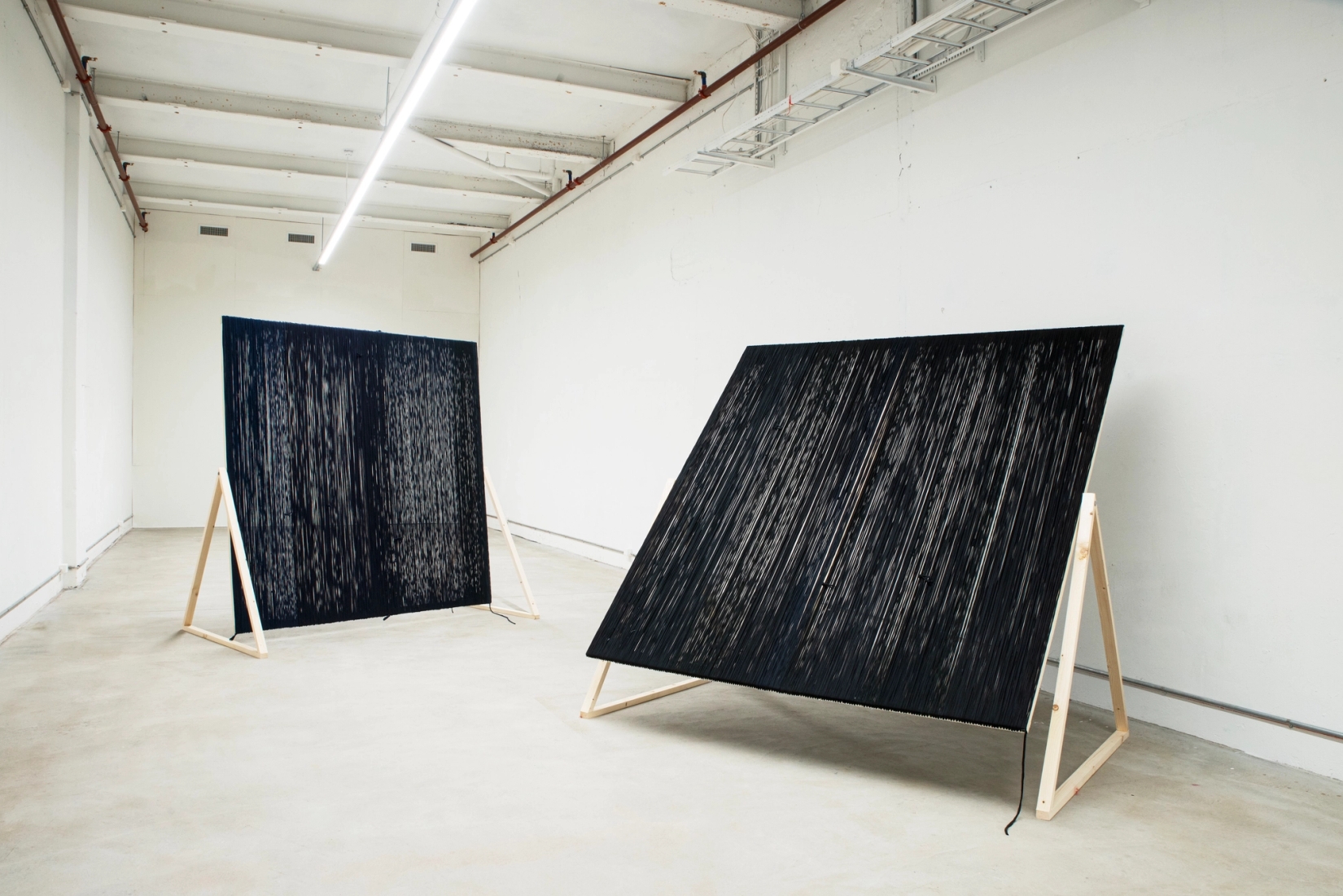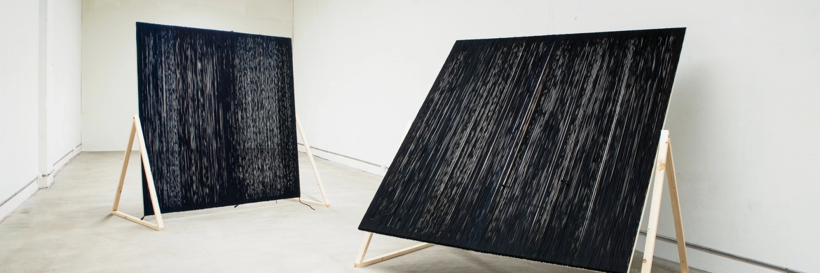 Vev: To frittstående rammer fylt med sort- og blåfarget jarkanter snorer. Jarene er avkappet bomullstoff fra tekstilindustrien. Vanligvis blir jaren kastet, her er de renning klargjort for nye vevde l…