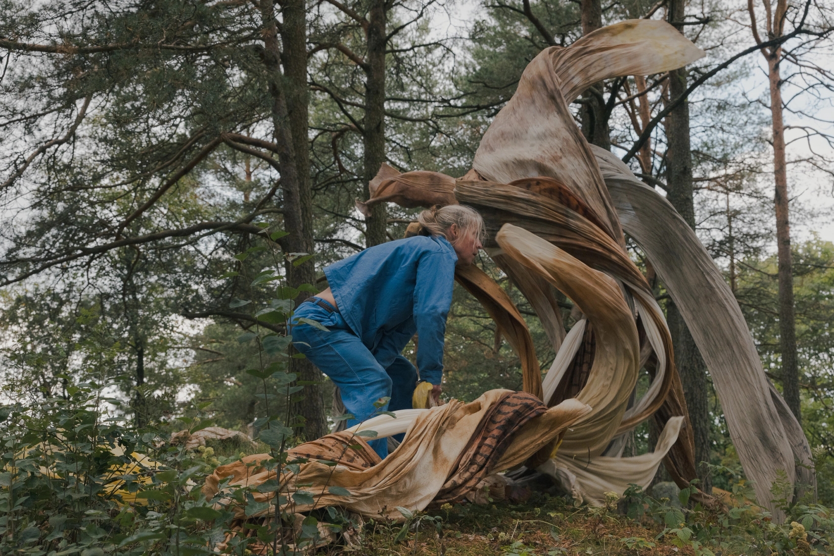 Den tekstile installasjonen, som jeg tenker på som en bylt, består av mer enn 100 meter silke som er surret som et stramt svøp rundt mange meter med gammelt linlerret. Bylten veier rundt 80 kilo og nå…