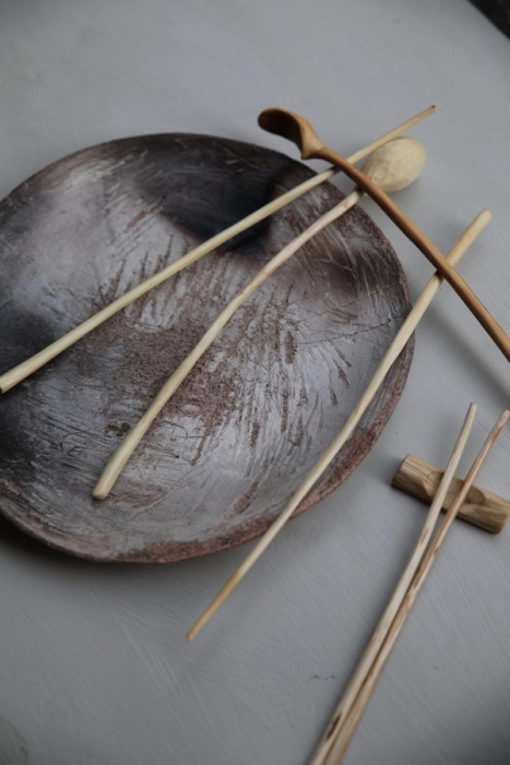 GRUPPEUTSTILLING Skeier og sushi pinnar laga av eik frå skogen heime på Vestlandet vart ein liten del av Per Olav Sølvbergs Studio Each i Bergen, og gruppeutstillinga Sannselig Omstart under Oslo Des…