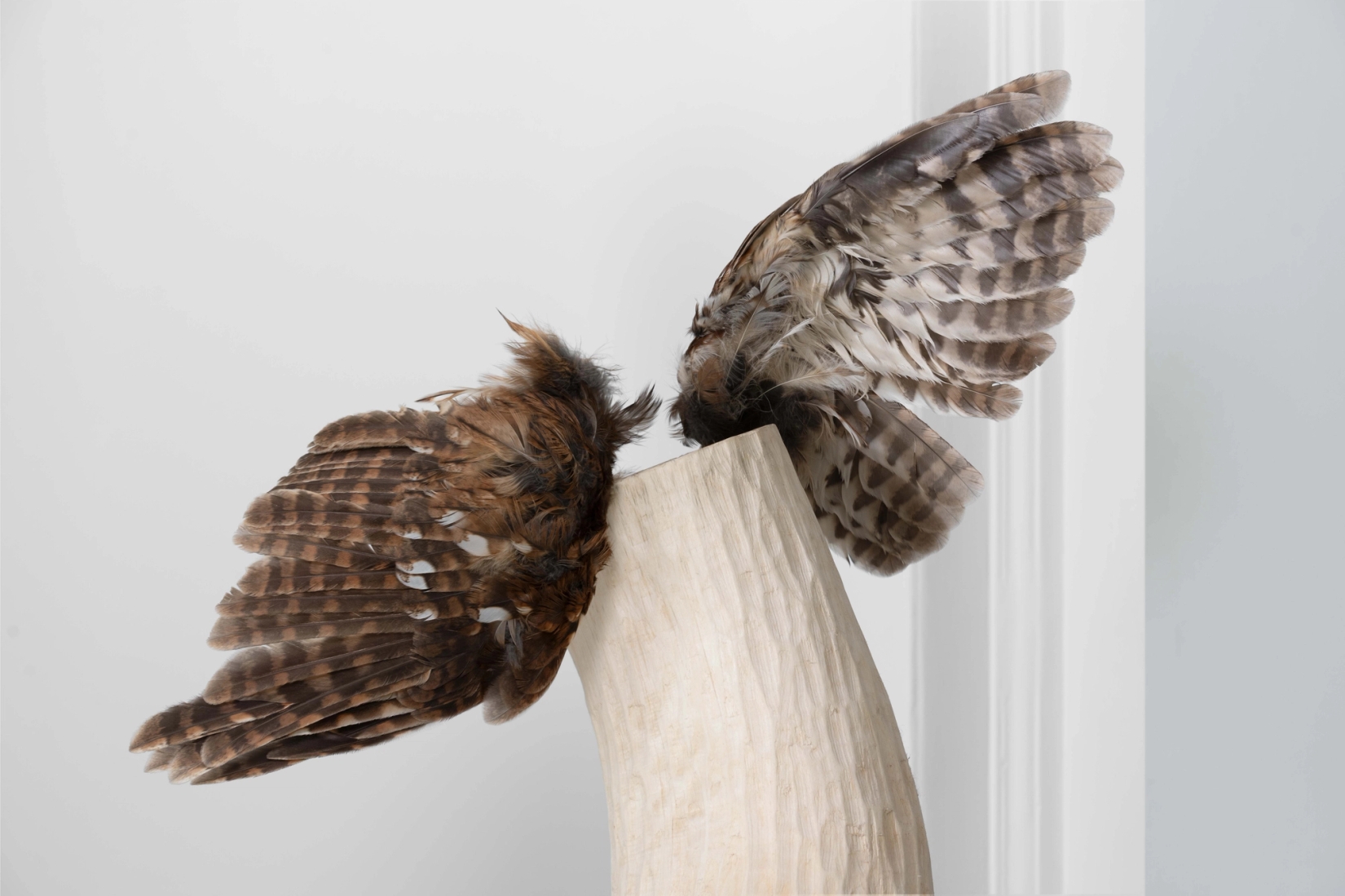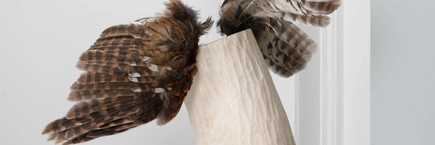 Forankret i det som er uønsket og stuet bort, gir Tysse nytt liv til funne elementer som hun danderer og pynter. Alt fra fuglevinger til løv, felger og trestokker gis omsorg, og kobles sammen i kontem…