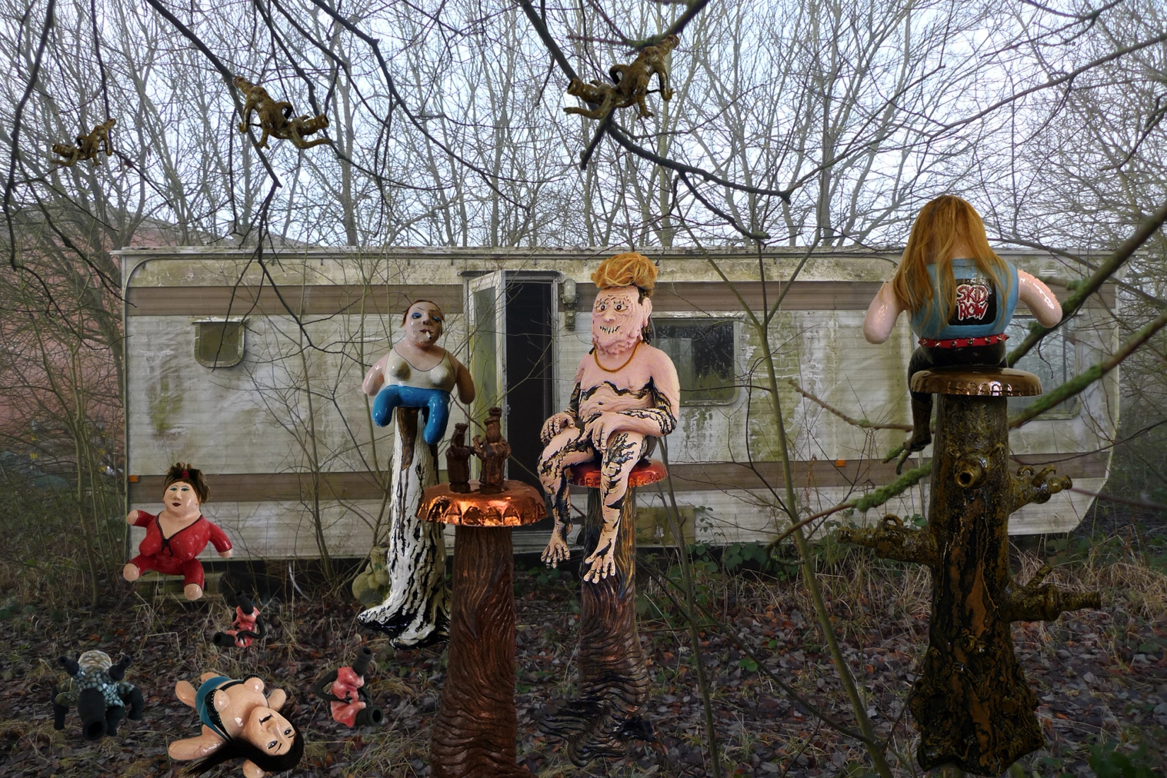 Photoshop-skisse til installasjon, 2018. Modellert, pressformet og dreiet steingods og leirgods, begitning, glasur, luster, hår, lim, fiberoptikk og LED. Variable størrelser til H 125 cm. Skulpturene …