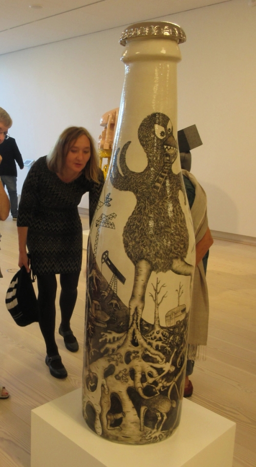 Modellert steingods, 245 x Ø 90 cm. Begitning, stains, oksider, glasur, luster. Laget på KHiO som gjestekunstner i perioden 2010-2012. Flasken er dumpet på Vulkan, og er til salgs for en rimelig pris…