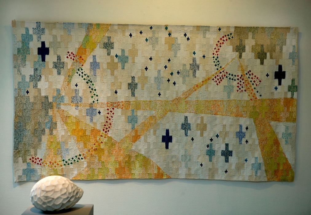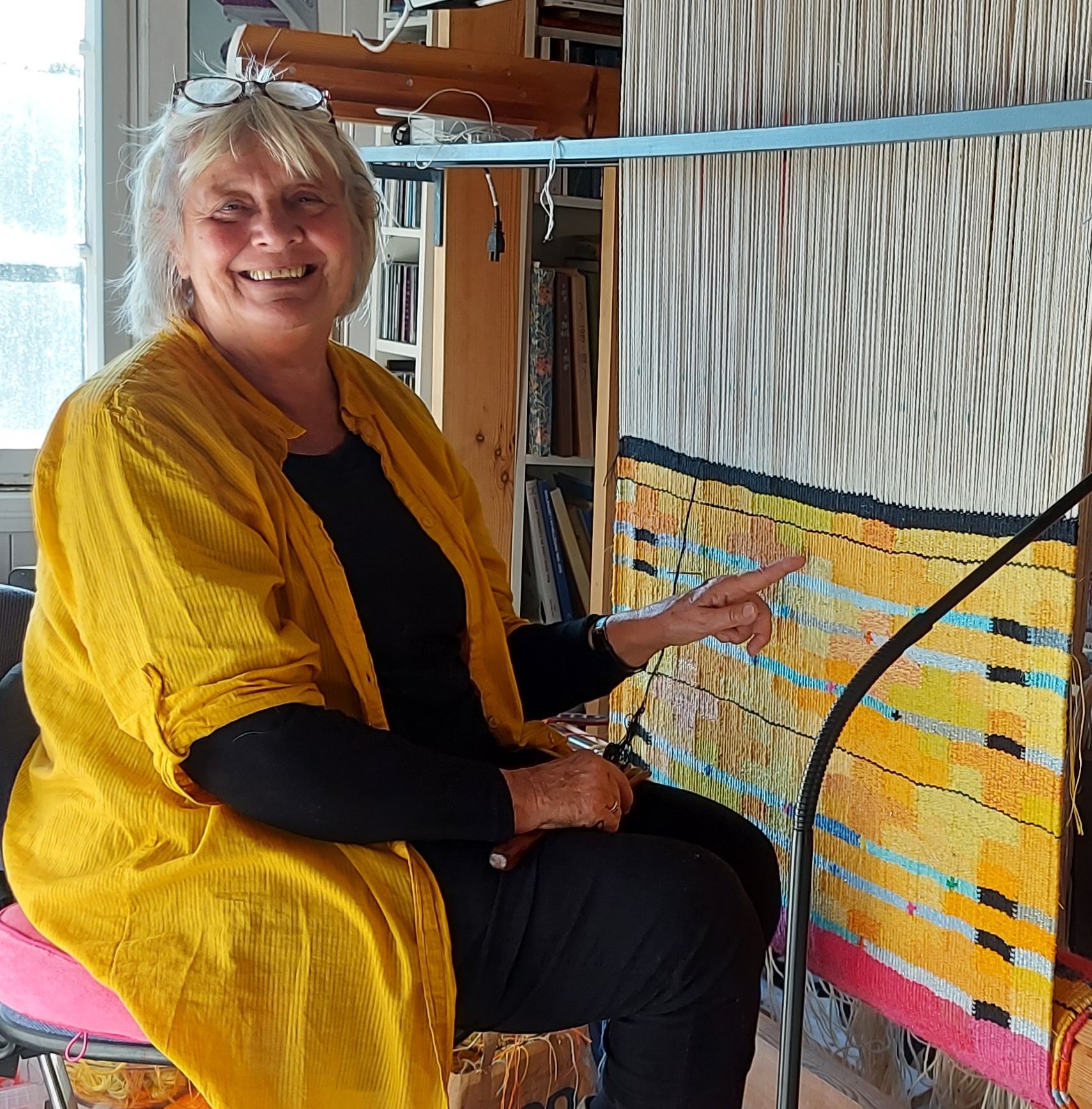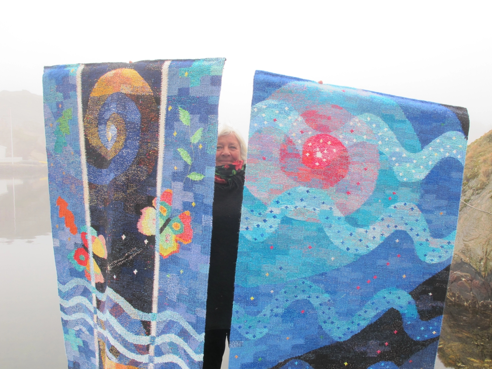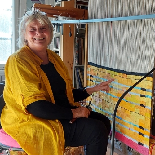 Tekstilkunstner siden ferdig utdannelse på SHKS i 1973 Utallige ustillinger, utsmykkinger, innkjøp, og mye annen aktivitet på kunstsektor, prosjektleder og ideskaper, museumspedagog, men etter at jeg ble velsignet med minstepensjon har jeg arbeidet 100% i verksted og skaper tepper og nye utstillinger. Tekst fra utstilling i Mandal 2024 «I Arbetets utkant « heter en bok jeg er glad i. Poeten Tomas Tranströmer er en jeg setter høyt, og denne boken kom ut etter hans død. Han har selv et dikt som har samme tittel. Jeg sendte det på sms til deg. Det er fint. Selv har jeg alltid en følelse for arbeidets utkant, det er der nye tanker, ideer ligger latent, det er der refleksjoner om det som har vært finnes. Det er veien bort til verkstedet, hjemover i mørket, det er alt det jeg har rundt meg i rommet, alt forteller en historie som i løpet av dagen pipler inn i tanken eller er bare som en følelse, et slags univers jeg puster i. Det tar så lang tid å veve, og det er den tiden jeg er glad i. At det går sent. At jeg må tro på det jeg gjør, hvis ikke gidder jeg ikke legge tråd på tråd. Noen ganger må det bære et par år, den troa som gir energien, gjennomføringskraften. Som det teppet som er 15 kvadratmeter. Jeg hører på lydbøker, hører musikk, og nå for tiden også podkaster, eller det er helt stille i rommet. Lyden av regn, eller måka som har lagt egg på taket og ruger. Mine journaler, at jeg følger med tiden, griper en tanke, kommer på noe, skisser eller bilder og skriver ned så jeg har metere med bøker som ikke er dagbøker, men definitivt i arbeidets utkant.