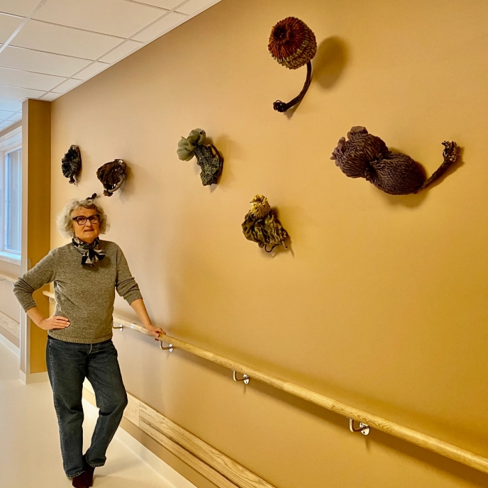 Utsmykking av det nye Nordlandssykehuset avdeling Vesterålen. Vaffelsøm på ull, og kråkeboller. H 160 x L 250 cm. Foto: Ingrid Larssen