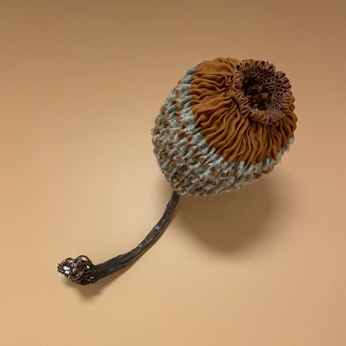 Vaffelsøm på plantefarget silkeorganza, montert på tare stilk. Innkjøpt av Sortland kommune til Fagerlundtunet Bo- og aktivitetssenter, Sortland. Foto: Solveig Ovanger.