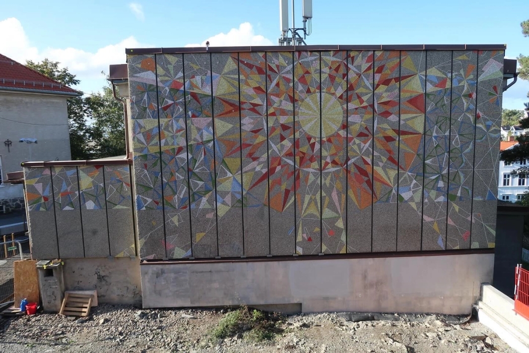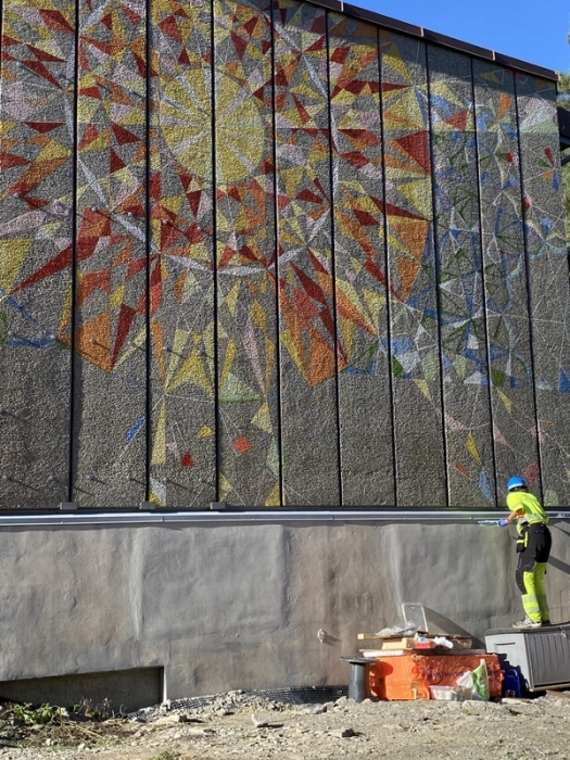 Nordstrand ungdomsskole, Kunst i offentlig rom for Oslo kommune. Veggmaleri på utvendig fasade. Akrylmaling på naturstein. 110 kvm.