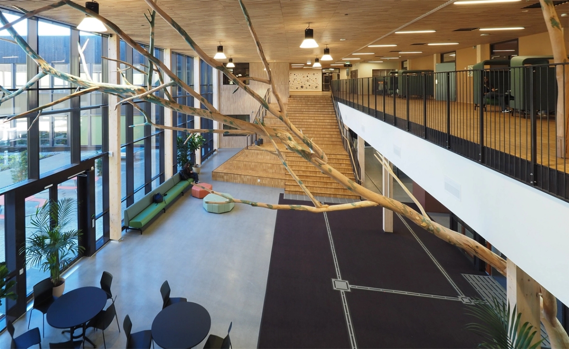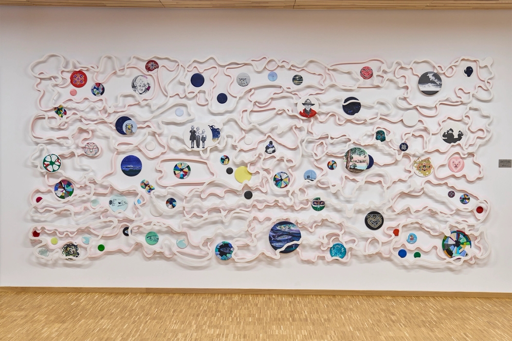 Utsmykning ved Stord VGs., Stord. I samarbeid med Gunnhild Bakke (maleriene), Ingunn (hovedkonstruksjonen) 435 x 270 cm Malt valchromat og innfelte maleri på mdf