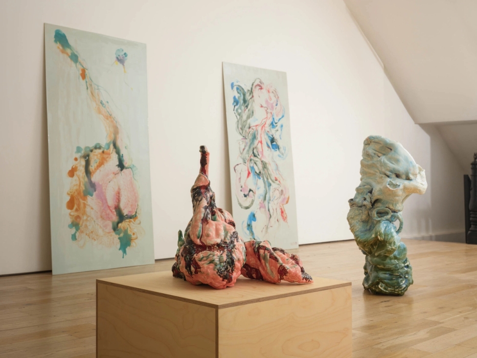 The Porcelain Room – an organic world of ceramic sculptures, arranged and combined with carpets, textiles, shelving, sofas, chairs, tables and a tree root. Everything is built, burned and broken into …