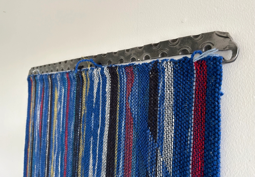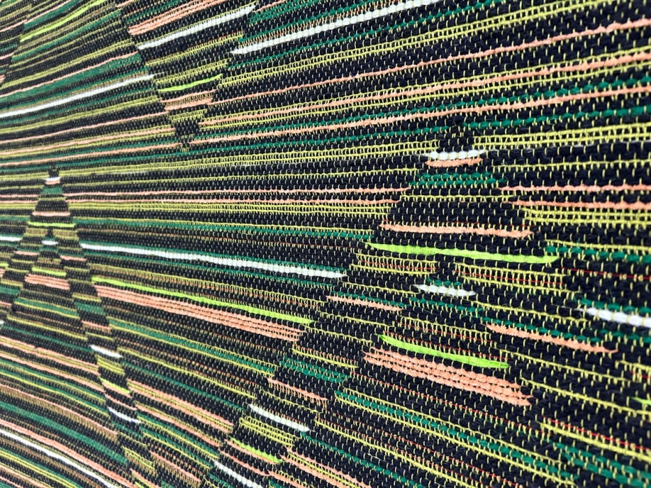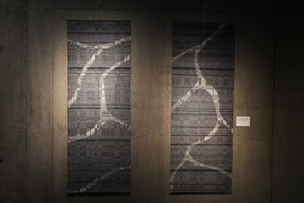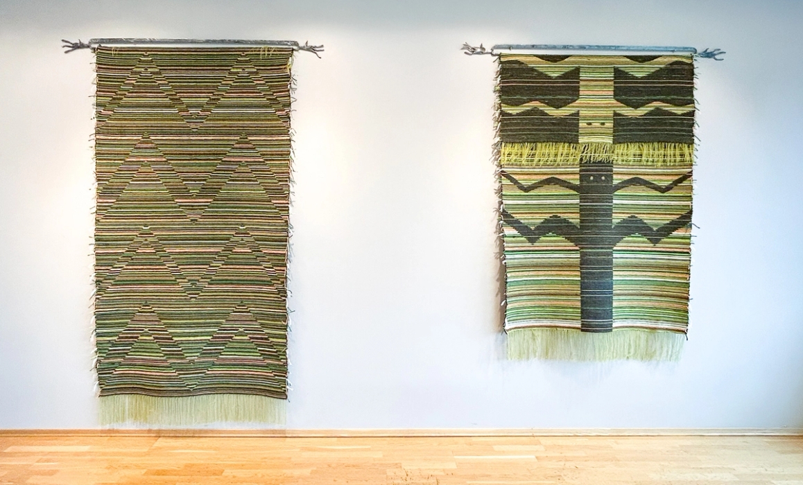 Fra utstilling med Dovre og Lesja Kunstforening. Vevde tekstiler i dobbeltbinding. Motivene viser zig-zag mønster eller frosker fra oven og viser til abstakte og symbolske mønstrene vi finner i tidlig…