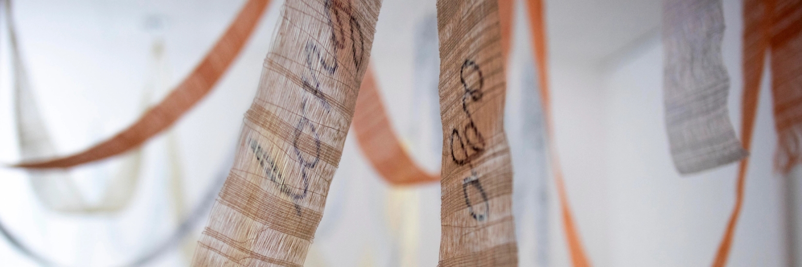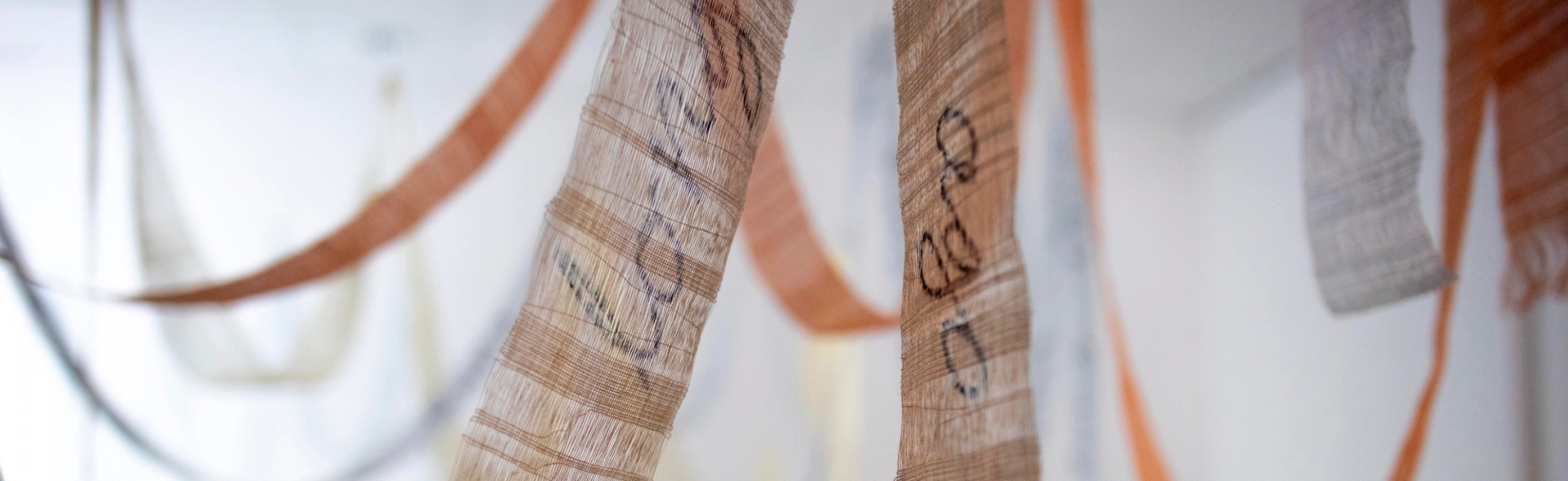 Fra utstillingen “Waving the Words”, Pleinkamer, Amsterdam, kurator Pernille Loenstrup. Håndvevde tekstiler i lerretsbinding med påskrevet tekst. Tekstilene er 15 cm brede og med en lengde fra 6 - 30 …