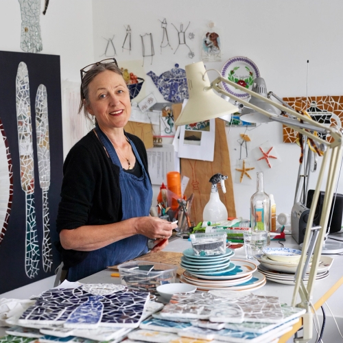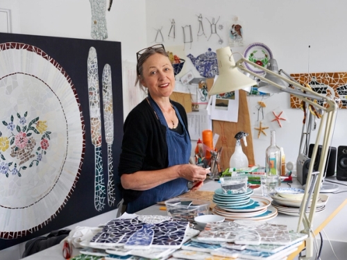 Materialene jeg bruker er kasserte tallerkener. Jeg klipper møysommelig tallerkenskår med tang, og setter dem sammen igjen til nye gjenkjennelige objekter. Ofte får jeg bruk for det som ingen andre vil ha, eller tallerkener som er ødelagte men fortsatt kan ha en verdi i mitt arbeide. Tallerkener bærer med seg en fornemmelse av tid og er interessante fordi de har vært i bruk og betydd noe for andre mennesker. Gjenbruk av materialene gir arbeidene flere lag som kanskje ikke er åpenbare ved første øyekast. Jeg er også opptatt av å belyse tankeløsheten i vår materielle verden og i alt som kastes, og det positive med resirkulering og gjenbruk.