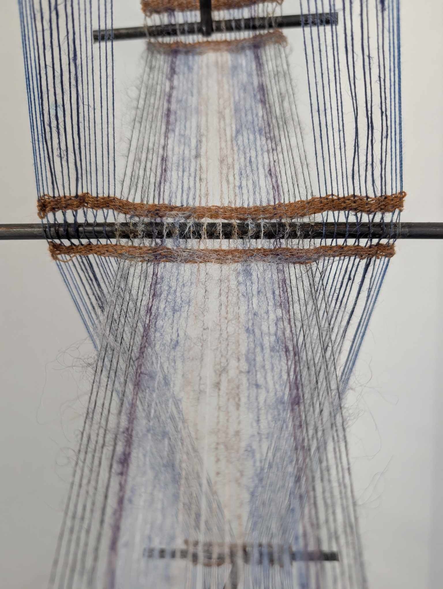 Sterk svak. Streng rufsete. 120x25 cm Jern, lin, mohair,ull. Inspirert av Peter Collingwoods Macrogause.