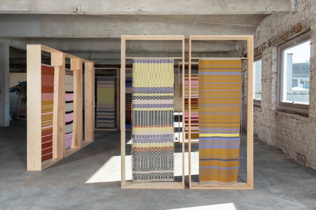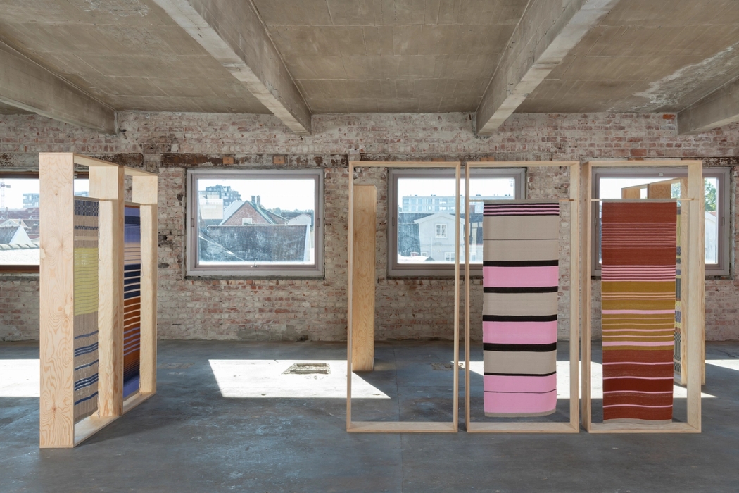 Lin, ull, furu Hver ramme: 210x88x24cm KLIKK! - Tekstilkunst i Fredrikstad i Nova Hutha visningsrom